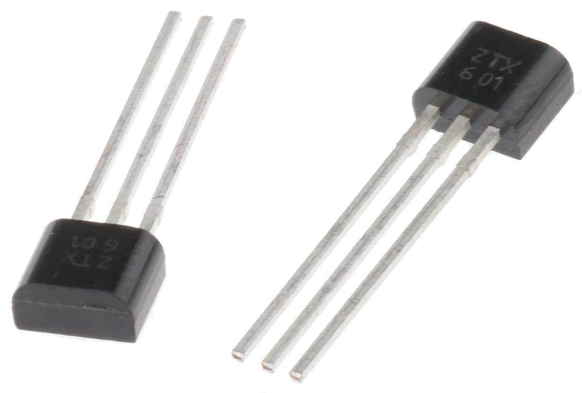 This is Diodes Inc NPN Darlington Pair 1 A 160 V HFE:1000 3-Pin E-Line manufactured by DiodesZetex. The manufacturer part number is ZTX601. It features up to 1000 of minimum DC current gain. The transistor is a npn type. The given dimensions of the product include 4.77 x 2.41 x 4.01mm. The product is available in through hole configuration. It features a 10 v of maximum emitter base voltage. The product has a maximum 1 a continuous collector current . Additionally, it has 180 v maximum collector base voltage. Whereas features a 160 v of collector emitter voltage (max). In addition, the product has a maximum 1.9 v base emitter saturation voltage . It has a maximum 0.00001ma collector cut-off current . In addition, the height is 4.01mm. Furthermore, the product is 2.41mm wide. Its accurate length is 4.77mm. The package is a sort of e-line. It consists of 1 elements per chip. Whereas, the minimum operating temperature of the product is -55 °c. The product has a maximum 1.2 v collector emitter saturation voltage . It has a maximum operating temperature of +200 °c. It contains 3 pins. The product offers single transistor configuration.