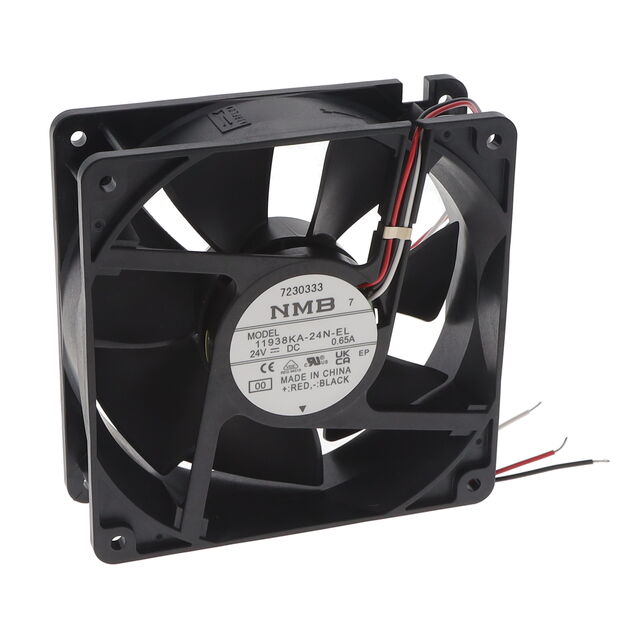 This is manufactured by NMB Technologies Corporation. The manufacturer part number is 11938KA-24N-EL-00. The blades are constructed from robust plastic materials. It is assigned with possible HTSUS value of 8414.59.6590. The product is rohs3 compliant. Furthermore, the product is 38.40mm wide. The product features power and watts of 12 w. It has a 129.9 cfm (3.64m³/min) air flow rate. While the voltage range is 18 ~ 25vdc. It has noise values of 50.0db. It also exhibits voltage rating of 24vdc. In addition, it is reach info available upon request. This has integrated with a ball, a bearing with long-lasting features. The product has 14 ~ 158°f (-10 ~ 70°c) operating temperature range. It provides maximum rpm up to 3600 rpm. This product offers longer life span for 100000 hrs @ 25°c. The product has a 0.440 in h2o (109.6 pa) static pressure. The product's diameters include square - 119mm l x 119mm h. The product features 3 wire leads termination style. It has a long 22 weeks standard lead time. Additionally, the product's output is 0.500a. Its typical moisture sensitivity level is not applicable. The splendid features of the product include auto restart, locked rotor sensor. The product 11938ka, is a highly preferred choice for users. The frame of the product is made from highly durable plastic materials. In addition, bulk is the available packaging type of the product. The latest designed fan is a type of tubeaxial offering unmatchable applications. The product is designated with the ear99 code number.