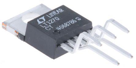 This is Flyback Inverting Step Down/Step Up DC-DC Converter 8A 5-Pin TO-220 manufactured by Linear Technology. The manufacturer part number is LT1270CT#PBF. Additionally, the product is supplied with 1 outputs. It is designed with standard flyback, inverting, step down/step up type converter . The given dimensions of the product include 10.541 x 4.572 x 9.398mm. The product is available in through hole configuration. Its output voltage (maximum) includes 60 v. It has a maximum operating temperature of +125 °c. Additionally, it is offered with 8a minimum output current . It has a maximum 0.07 mhz switching frequency. Furthermore, it has afixed output. In addition, the height is 9.398mm. Furthermore, the product is 4.572mm wide. Its accurate length is 10.54mm. 30 v is the maximum voltage of the bespoke product. The package is a sort of to-220. It has a switching regulator yes . Whereas, the minimum operating temperature of the product is 0 °c. The product has 3.5 v of minimum input voltage. Featuring 16a of maximum output current. It contains 5 pins. Has a line regulation of 0.03 %/v.