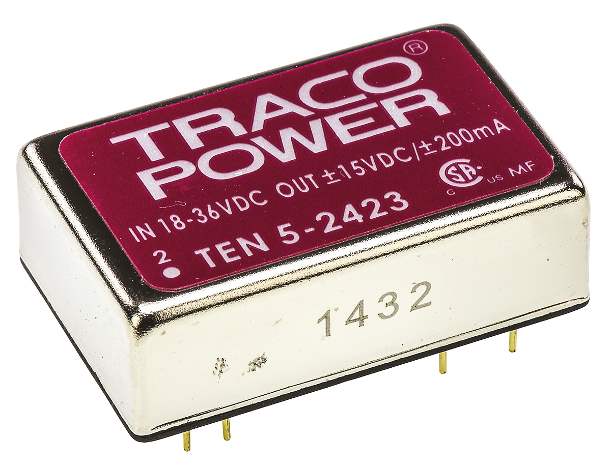 This is TEN 5 6W Isolated DC-DC Converter Through Hole Vin 18 → 36 V dc Vout 15V dc I/O isolation 1.5kV dc manufactured by TRACOPOWER. The manufacturer part number is TEN 5-2423. Additionally, the product is supplied with 2 outputs. Load Regulation - ±5%. It has 1.5kv dc isolation voltage. It is a highly efficient product with an 86% of high efficiency. The product is available in through hole configuration. It is shipped in dip 24 package . The product has +85°c maximum temperature. The product ten 5, is a highly preferred choice for users. It has 18 → 36 v dc of input voltage range. Its accurate length is 32mm. Isolated options - yes. Furthermore, the product is 20mm wide. The product comes in 10mm depth. Features a ±15v dc output voltage. While its minimum temperature is -40°c. It has 24 v dc of nominal input voltage. Feature 6w of power rating. It carries ±200ma output current. The product complies with all safety standards, such as en 60950-1.