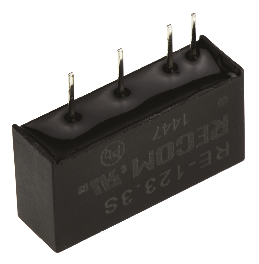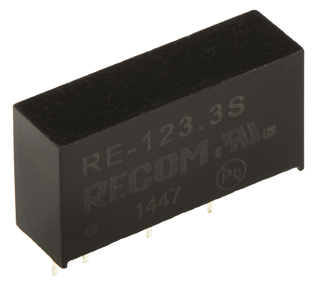 This is RE 1W Isolated DC-DC Converter Through Hole Vin 10.8 → 13.2 V dc Vout 3.3V dc manufactured by Recom. The manufacturer part number is RE-123.3S. Additionally, the product is supplied with 1 outputs. Load Regulation - 20%. It has 1kv dc isolation voltage. It is a highly efficient product with an 75% of high efficiency. The product is available in through hole configuration. It is shipped in sip package . The product has +85°c maximum temperature. The product re, is a highly preferred choice for users. It has 10.8 → 13.2 v dc of input voltage range. Its accurate length is 19.6mm. Isolated options - yes. Furthermore, the product is 6mm wide. The product comes in 10.2mm depth. Features a 3.3v dc output voltage. While its minimum temperature is -40°c. It has 12 v dc of nominal input voltage. Feature 1w of power rating. It carries 300ma output current. The product complies with all safety standards, such as csa-c22.2 no. 60950-1, en 60950, iec, iec/en 60950-1, ul, ul 60950-1.