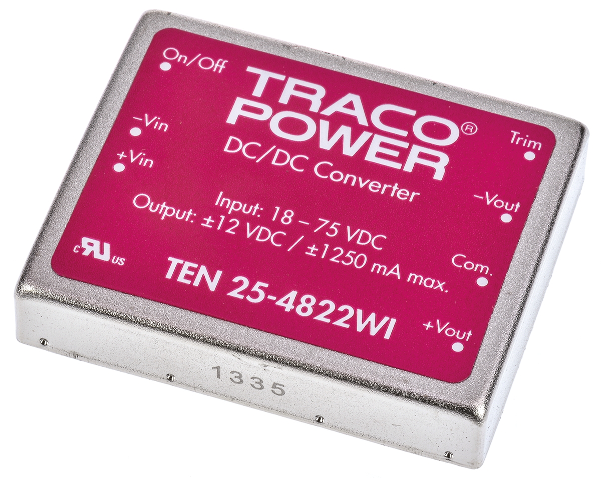 This is TEN 25WI 25 W 30 W Isolated DC-DC Converter Through Hole Vin 18 → 75 V dc Vout ±12V dc manufactured by TRACOPOWER. The manufacturer part number is TEN 25-4822WI. Additionally, the product is supplied with 2 outputs. Load Regulation - ±1%. It has 1.5kv dc isolation voltage. It carries ±1.25a output current. The product is available in through hole configuration. It is shipped in 1 x 1.6 in package . The product has +85°c maximum temperature. The product ten 25wi, is a highly preferred choice for users. It has 18 → 75 v dc of input voltage range. Isolated options - yes. It is a highly efficient product with an 89% of high efficiency. The product comes in 9.3mm depth. Features a ±12v dc output voltage. Its accurate length is 50mm. While its minimum temperature is -40°c. It has 48 v dc of nominal input voltage. Feature 25 w, 30w of power rating.