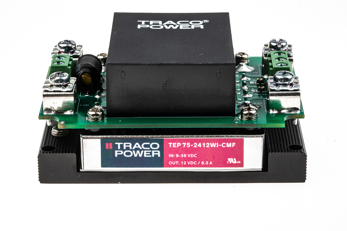 This is TEP 75WI 75W Isolated DC-DC Converter Chassis Mount Vin 9 → 36 V dc Vout 12V dc manufactured by TRACOPOWER. The manufacturer part number is TEP 75-2412WI-CMF. It has 3kv ac isolation voltage. While its minimum temperature is -40°c. Isolated options - yes. Furthermore, the product is 61mm wide. The product has +75°c maximum temperature. Load Regulation - 0.1%. The product complies with all safety standards, such as en 55032, iec/en/ul 60950-1, iec/en/ul 62368-1. The product is railway approved yes . It is a highly efficient product with an 88% of high efficiency. Additionally, the product is supplied with 1 outputs. It has 9.6 → 13.2v dc of output voltage adjustment range. It is shipped in enclosed package . Its accurate length is 85mm. It carries 6.3a output current. The product is available in chassis mount configuration. The product tep 75wi, is a highly preferred choice for users. It has 9 → 36 v dc of input voltage range. The product comes in 40.5mm depth. Features a 12v dc output voltage. It has 24 v dc of nominal input voltage. Feature 76w of power rating.