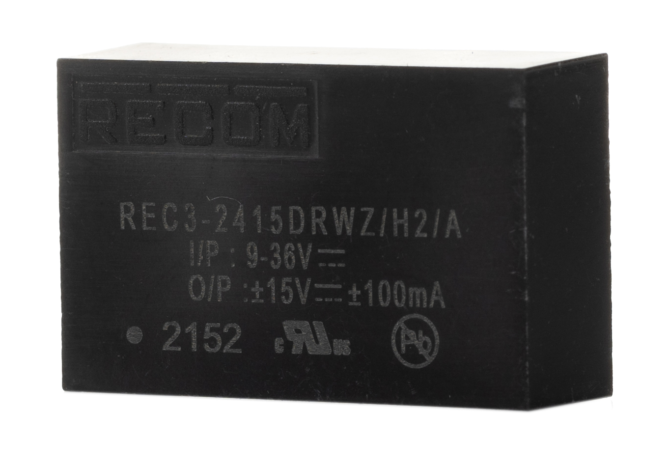 This is REC3 3W Isolated DC-DC Converter Through Hole Vin 9 → 36 V dc Vout ±15V dc I/O isolation 2kV dc manufactured by Recom. The manufacturer part number is REC3-2415DRWZ/H2/A. It has 2kv dc isolation voltage. While its minimum temperature is -40°c. Isolated options - yes. Furthermore, the product is 20.3mm wide. The product has +85°c maximum temperature. Load Regulation - ±0.6%. The product complies with all safety standards, such as ul 60950-1. It is a highly efficient product with an 86% of high efficiency. Additionally, the product is supplied with 2 outputs. It is shipped in dip 24 package . Its accurate length is 32mm. Medical Approval - yes. It carries ±100ma output current. The product is available in through hole configuration. The product rec3, is a highly preferred choice for users. It has 9 → 36 v dc of input voltage range. The product comes in 10.2mm depth. Features a ±15v dc output voltage. It has 24 v dc of nominal input voltage. Feature 3w of power rating.