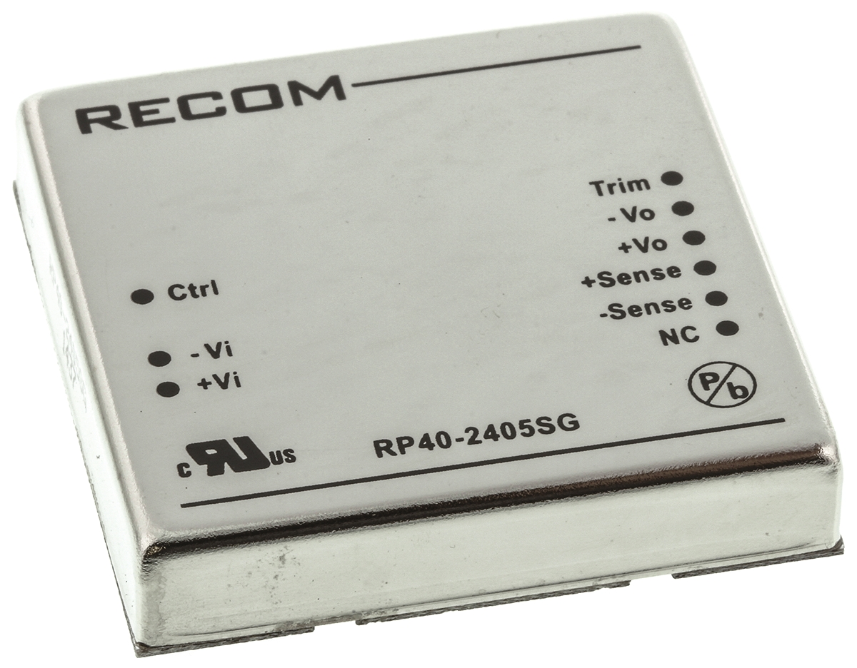This is RP40 G 40W Isolated DC-DC Converter Through Hole Vin 18 → 36 V dc Vout 5V dc I/O isolation 1.6kV dc manufactured by Recom. The manufacturer part number is RP40-2405SG. Additionally, the product is supplied with 1 outputs. It has 1.6kv dc isolation voltage. It carries 8a output current. The product is available in through hole configuration. The product has +85°c maximum temperature. The product rp40 g, is a highly preferred choice for users. It has 18 → 36 v dc of input voltage range. Its accurate length is 51.3mm. Isolated options - yes. The product comes in 10.2mm depth. Features a 5v dc output voltage. While its minimum temperature is -40°c. It has 24 v dc of nominal input voltage. Feature 40w of power rating.