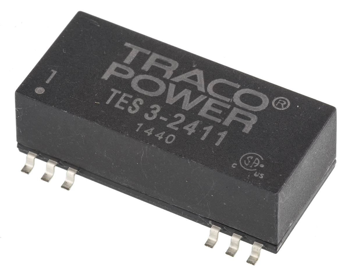This is TES 3 3W Isolated DC-DC Converter Surface Mount Vin 18 → 36 V dc Vout 5V dc I/O isolation 1.5kV dc manufactured by TRACOPOWER. The manufacturer part number is TES 3-2411. Additionally, the product is supplied with 1 outputs. It has 1.5kv dc isolation voltage. It carries 600ma output current. The product is available in surface mount configuration. It is shipped in smd package . The product has +85°c maximum temperature. The product tes 3, is a highly preferred choice for users. It has 18 → 36 v dc of input voltage range. Its accurate length is 32.3mm. Isolated options - yes. The product comes in 9.7mm depth. Features a 5v dc output voltage. While its minimum temperature is -40°c. It has 24 v dc of nominal input voltage. Feature 3w of power rating.