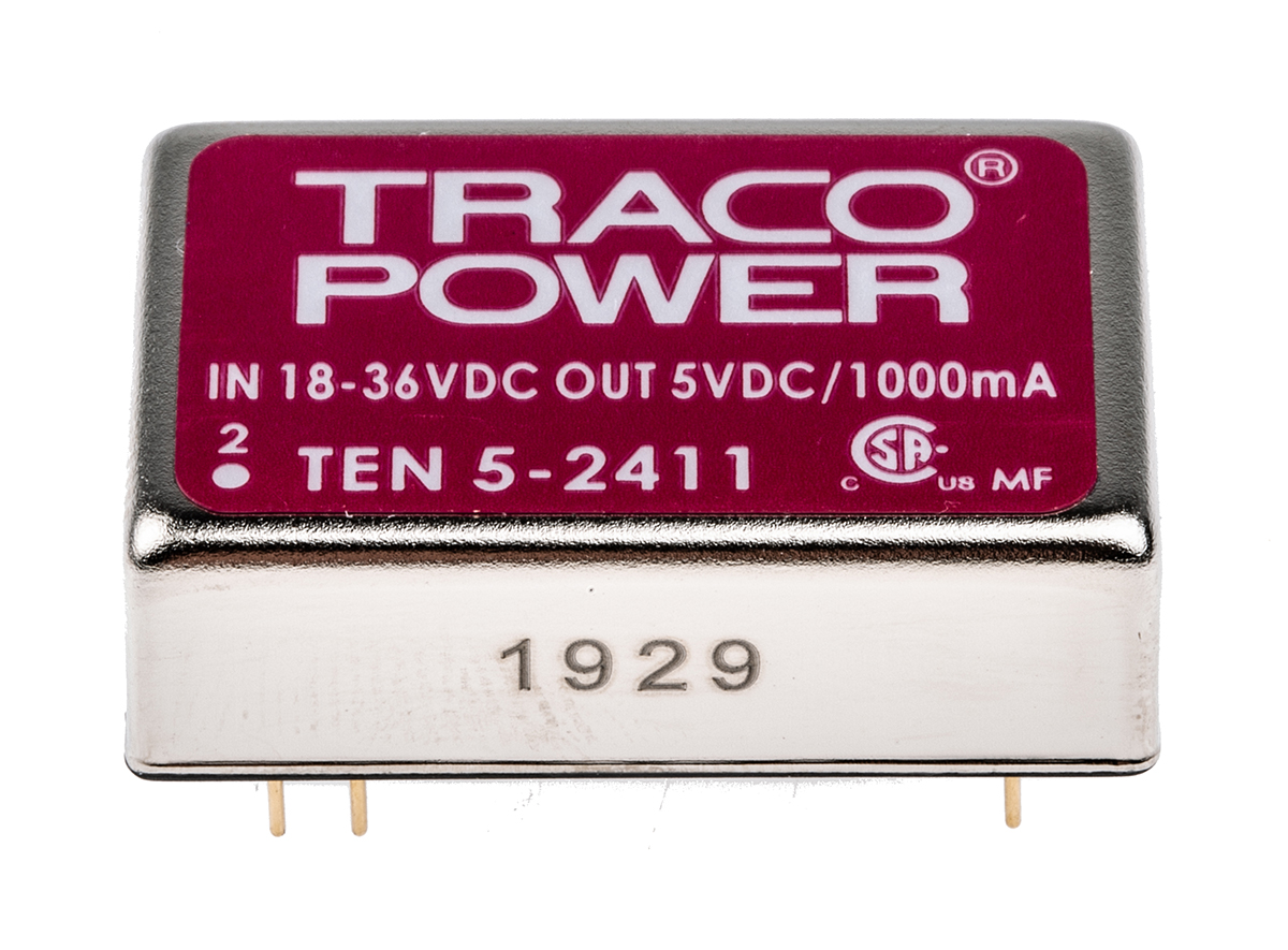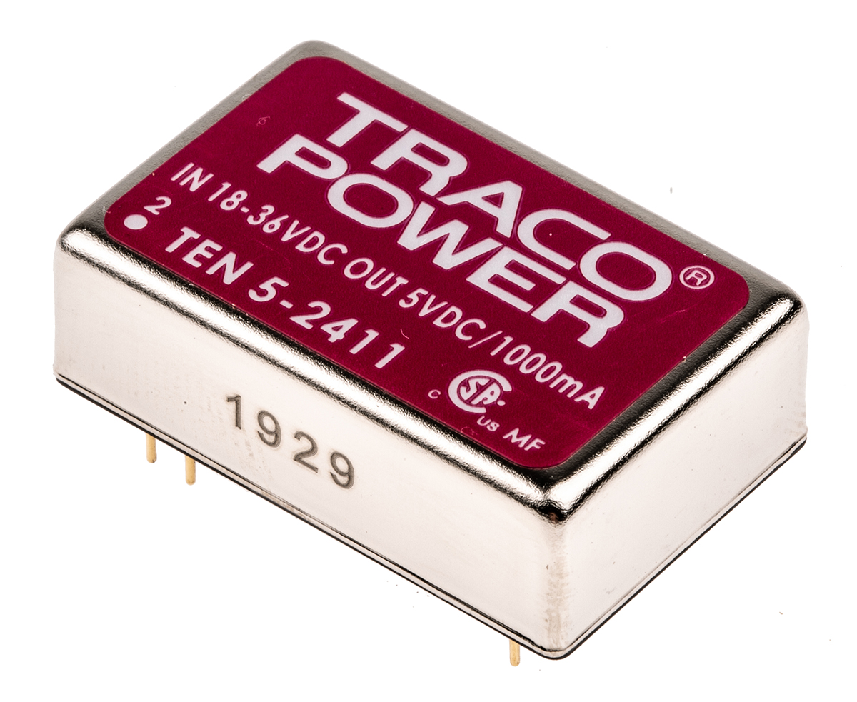 This is TEN 5 6W Isolated DC-DC Converter Through Hole Vin 18 → 36 V dc Vout 5V dc I/O isolation 1.5kV dc manufactured by TRACOPOWER. The manufacturer part number is TEN 5-2411. Additionally, the product is supplied with 1 outputs. Load Regulation - ±1%. It has 1.5kv dc isolation voltage. It is a highly efficient product with an 83% of high efficiency. The product is available in pcb mount configuration. It is shipped in dip 24 package . The product has +85°c maximum temperature. The product ten 5, is a highly preferred choice for users. It has 18 → 36 v dc of input voltage range. Its accurate length is 32mm. Isolated options - yes. Furthermore, the product is 20mm wide. The product comes in 10mm depth. Features a 5v dc output voltage. While its minimum temperature is -40°c. It has 24 v dc of nominal input voltage. Feature 5w of power rating. It carries 1a output current. The product complies with all safety standards, such as ul 60950-1.