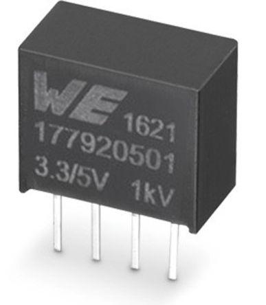 This is Isolated Buck Boost Switching Regulator 0mA 4-Pin SIP manufactured by Wurth Elektronik. The manufacturer part number is 177920521. The given dimensions of the product include 11.5 x 6 x 10mm. Additionally, it is offered with 0ma minimum output current . Furthermore, the product is 6mm wide. Its output voltage (maximum) includes 5.25 v dc. Load Regulation - -5 %, +15 %. Furthermore, it has afixed output. It has a maximum 105 khz switching frequency. It is a highly efficient product with an 80% of high efficiency. The package is a sort of sip. It has a maximum operating temperature of +85 °c. Additionally, the product is supplied with 1 outputs. It is designed with standard isolated type converter . Has a line regulation of ±1.2 %. Its accurate length is 11.5mm. The product features 4.75 v dc minimum output voltage. It contains 4 pins. The product is available in through hole configuration. In addition, the height is 10mm. Whereas, the minimum operating temperature of the product is -40 °c. Featuring 200ma of maximum output current. 13.2 v dc is the maximum voltage of the bespoke product. The product has 10.8 v of minimum input voltage.