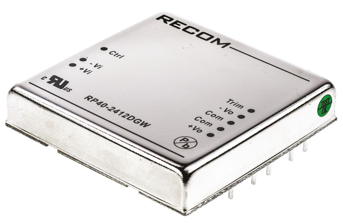 This is RP40 GW 40W Isolated DC-DC Converter Through Hole Vin 9 → 36 V dc Vout ±12V dc I/O isolation 1.6kV dc manufactured by Recom. The manufacturer part number is RP40-2412DGW. Additionally, the product is supplied with 2 outputs. It has 1.6kv dc isolation voltage. It carries ±1.67a output current. The product is available in through hole configuration. The product has +105°c maximum temperature. The product rp40 gw, is a highly preferred choice for users. It has 9 → 36 v dc of input voltage range. Its accurate length is 51.3mm. Isolated options - yes. The product comes in 10.2mm depth. Features a ±12v dc output voltage. While its minimum temperature is -40°c. It has 24 v dc of nominal input voltage. Feature 40w of power rating.