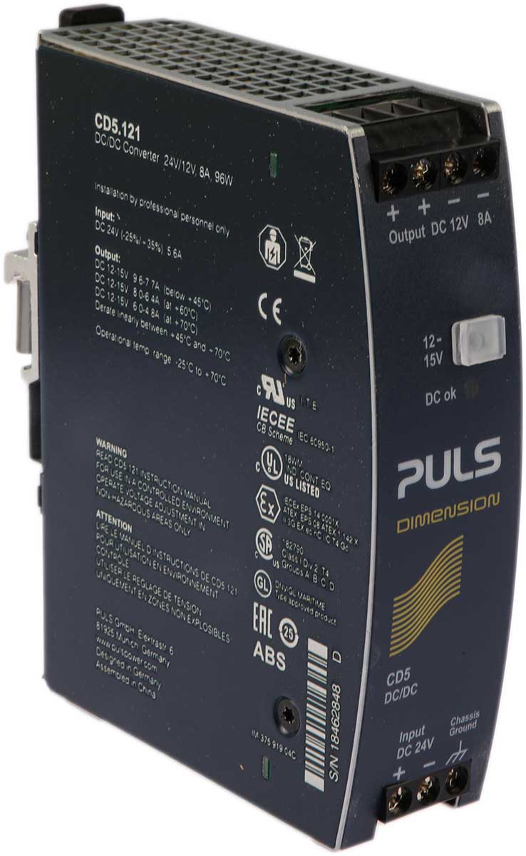 This is DIMENSION-CD 96W Isolated DC-DC Converter DIN Rail Mount Vin 18 → 32.4 V dc Vout 12V dc manufactured by PULS. The manufacturer part number is CD5.121. Additionally, the product is supplied with 1 outputs. It has 12 → 15v of output voltage adjustment range. Load Regulation - 120mv. It has 500v dc isolation voltage. It carries 8a output current. The product is available in din rail mount configuration. It is a highly efficient product with an 88.2% of high efficiency. The product has +70°c maximum temperature. The product dimension-cd, is a highly preferred choice for users. It has 18 → 32.4 v dc of input voltage range. Its accurate length is 124mm. Isolated options - yes. Furthermore, the product is 32mm wide. The product comes in 102mm depth. Features a 12v dc output voltage. While its minimum temperature is -25°c. It has 24 v dc of nominal input voltage. Feature 96w of power rating.