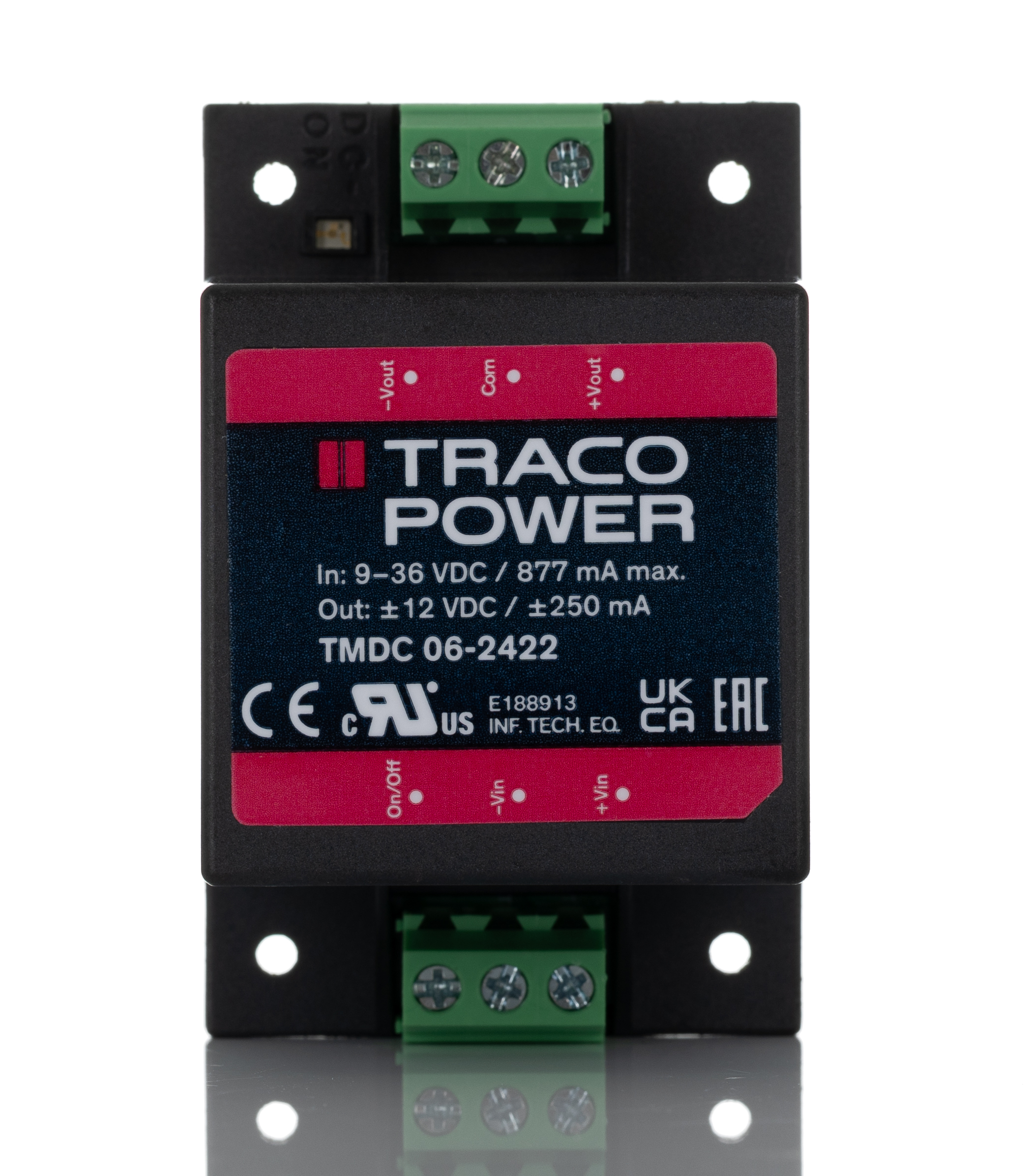 This is DC/DC Converter Isolated +/-12V 6W manufactured by TRACOPOWER. The manufacturer part number is TMDC 06-2422. Additionally, the product is supplied with 2 outputs. Load Regulation - 0.5 %, 2 (balanced load) %. It has 3kv dc isolation voltage. It is a highly efficient product with an 84% of high efficiency. The product is available in chassis mount configuration. It is shipped in encapsulated package . The product has +80°c maximum temperature. The product tmdc 06, is a highly preferred choice for users. It has 9 → 36 v dc of input voltage range. Its accurate length is 53mm. Isolated options - yes. Furthermore, the product is 34mm wide. The product comes in 26.5mm depth. Features a ±12v dc output voltage. While its minimum temperature is -40°c. It has 24 v dc of nominal input voltage. Feature 6w of power rating. It carries ±250ma output current. The product complies with all safety standards, such as ce.