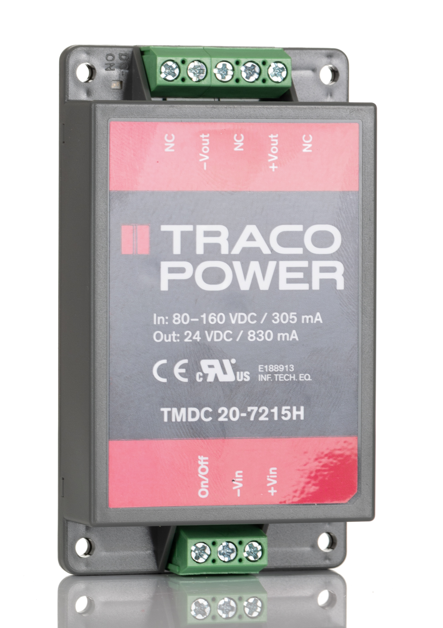 This is TMDC 20H 20W Isolated DC-DC Converter Chassis Mount Voltage in 80 → 160 V dc Voltage out 24V dc manufactured by TRACOPOWER. The manufacturer part number is TMDC 20-7215H. It has 3kv isolation voltage. While its minimum temperature is -40°c. Isolated options - yes. Furthermore, the product is 54mm wide. The product has +95°c maximum temperature. Load Regulation - 0.01. The product complies with all safety standards, such as ce. The product is railway approved no . It is a highly efficient product with an 0.88 of high efficiency. Additionally, the product is supplied with 1 outputs. It has -2 → +2% of output voltage adjustment range. The product comes in 23.3mm depth. Medical Approval - no. It carries 830ma output current. The product is available in chassis mount configuration. The product tmdc 20h, is a highly preferred choice for users. It has 80 → 160 v dc of input voltage range. Its accurate length is 96mm. Features a 24v dc output voltage. It has 110 v dc of nominal input voltage. Feature 20w of power rating.