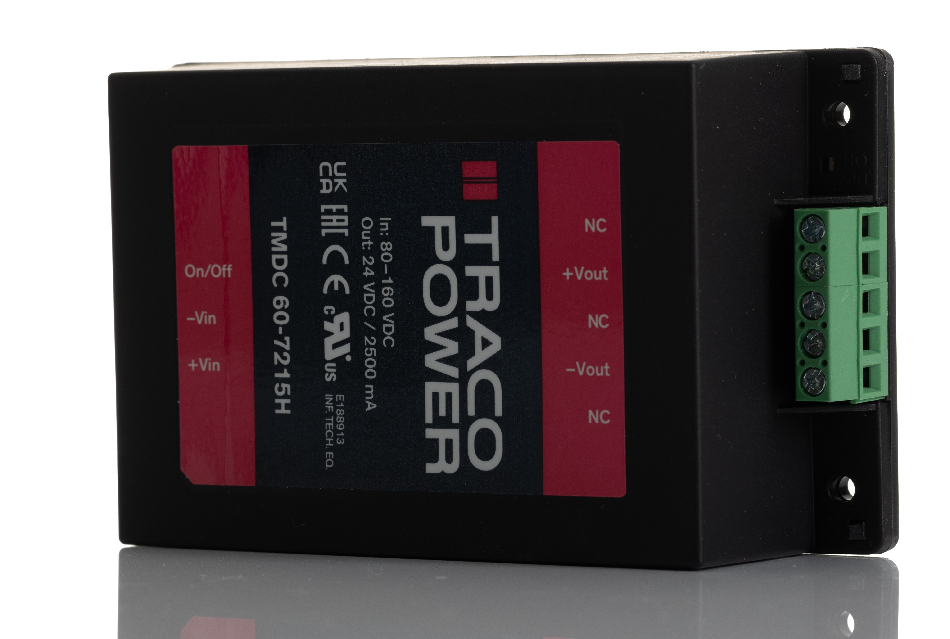 This is TMDC 60H 60W Isolated DC-DC Converter Chassis Mount Voltage in 80 → 160 V dc Voltage out 24V dc manufactured by TRACOPOWER. The manufacturer part number is TMDC 60-7215H. It has 3kv isolation voltage. While its minimum temperature is -40°c. Isolated options - yes. Furthermore, the product is 67.8mm wide. The product has +90°c maximum temperature. Load Regulation - 0.01. The product complies with all safety standards, such as en 62368-1. The product is railway approved no . It is a highly efficient product with an 0.88 of high efficiency. Additionally, the product is supplied with 1 outputs. It has -2 → +2% of output voltage adjustment range. The product comes in 38mm depth. Medical Approval - no. It carries 2.5a output current. The product is available in chassis mount configuration. The product tmdc 60h, is a highly preferred choice for users. It has 80 → 160 v dc of input voltage range. Its accurate length is 112mm. Features a 24v dc output voltage. It has 110 v dc of nominal input voltage. Feature 60w of power rating.