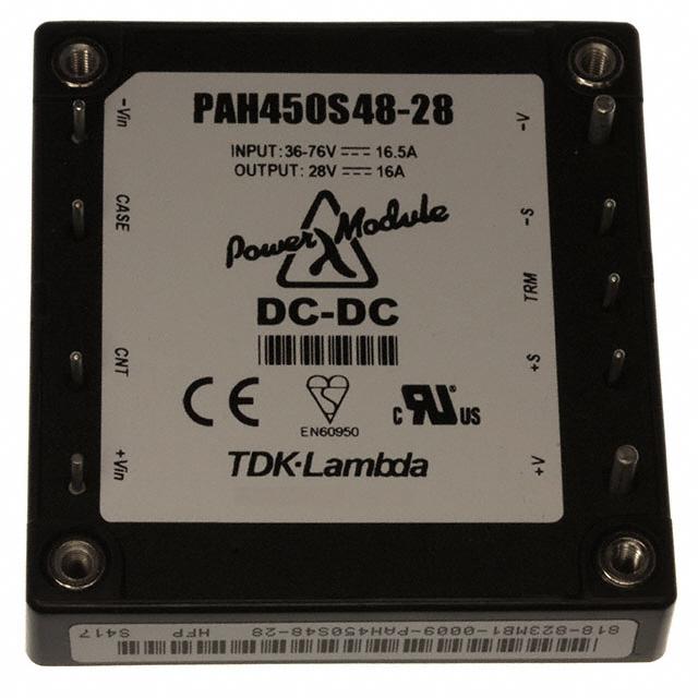 This is manufactured by TDK-Lambda Americas Inc. The manufacturer part number is PAH450S48-28. It is assigned with possible HTSUS value of 8504.40.9580. The product is rohs compliant. It has a 28v output voltage. The product features power and watts of 450 w. The maximum product's output current is 16a. Moreover, the product comes in 9-dip module, 1/2 brick. It offers 36v of minimum input voltage. It comes in isolated module configuration. The product is widely employed in ite (commercial). In addition, it is reach unaffected. It is a highly efficient product with an 92% of high efficiency. Its maximum input voltage is 76v. It is shipped in bulk package . The product's diameters include 2.40" l x 2.28" w x 0.50" h (61.0mm x 57.9mm x 12.7mm). It has a long 15 weeks standard lead time. 1.5 kv of isolation voltage. Its typical moisture sensitivity level is not applicable. The splendid features of the product include remote on/off, ocp, ovp. The product is available in through hole configuration. The product pah450s (450w), is a highly preferred choice for users. The product has -40°c ~ 100°c operating temperature range. Moreover, it corresponds to pah450, a base product number of the product. Additionally, the product is supplied with 1 outputs. The product is designated with the ear99 code number.