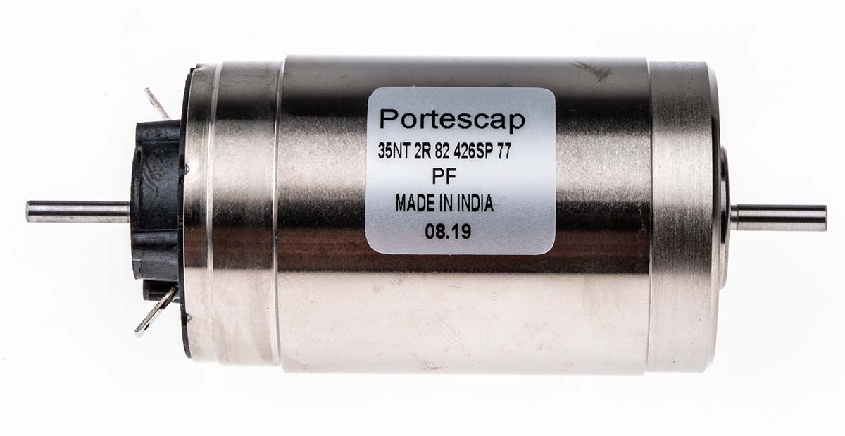 This is DC Motor 102 W 32 V dc 115 mNm 5900 rpm 5mm Shaft Diameter manufactured by Portescap. The manufacturer part number is 35NT2R 82 426SP.77. The diameter of the shaft is 3mm. The product has a current rating of 2.3 a. The given dimensions of the product include 35 (dia.) x 57.2 mm. Its output speed is 5900 rpm . Its maximum output torque is about 115 mnm . In addition, in includes a brushed type DC motor . Its accurate length is 57.2mm. Features 32 v supply voltage. Feature 102 w of power rating. Moreover, it has a/an ironless core construction .