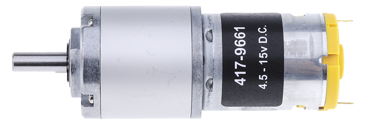 This is 12 V 6 → 15 V dc 10000 gcm Brushed DC Geared Motor Output Speed 99 rpm manufactured by RS Pro. The manufacturer part number is 417-9661. The diameter of the shaft is 6mm. The product has a current rating of 990 ma. In addition, in includes a brushed geared type DC motor . The product 940d, is a highly preferred choice for users. Its output speed is 99 rpm . It has an adorable planetary type gearhead . Its maximum output torque is about 98 ncm . Furthermore, the product is 32 (dia.)mm wide. Its accurate length is 70.5mm. Features 12 v dc supply voltage. Feature 7.92 w of power rating. Moreover, it has a/an iron core core construction .