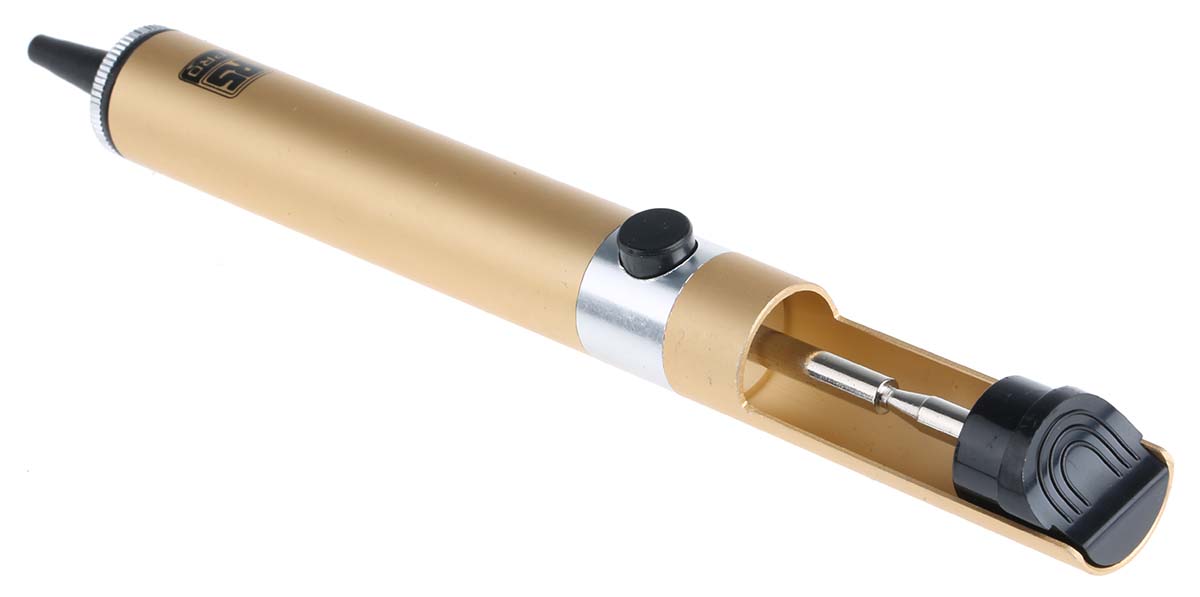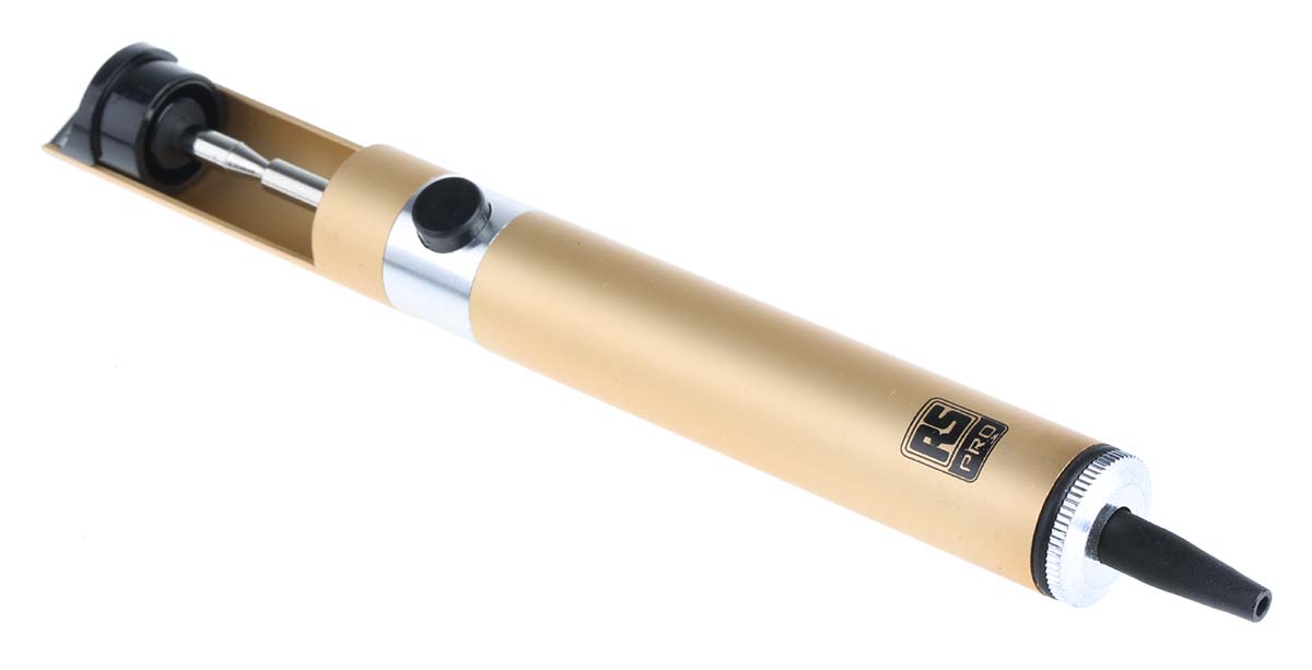 This is 195mm Standard Aluminium Anti-Static Desoldering Pump manufactured by RS Pro. The manufacturer part number is 151-3012. Additionally, it has a solder sucker desoldering tool . It has an overall length of 195 mm.