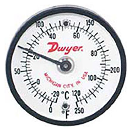 This is Dial Thermometer Centigrade Fahrenheit Scale -20 → +120 °C 51mm dia. Surface manufactured by DWYER INSTRUMENTS. The manufacturer part number is ST250. In addition, it is offered with ±2 % best accuracy . Its dial diameter is about 51mm . It has a/an surface type thermometer . Applications Information involves air ducts, bearings, boilers, cabinets, drums, enclosures, engines, ferrous surfaces, furnaces, manifolds, motors, piping, platens, plumbing, refrigerators. Additionally, it has a maximum +120 °c temperature measurement . Additionally, it exhibits centigrade, fahrenheit temperature scale .