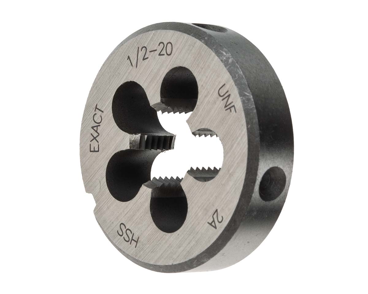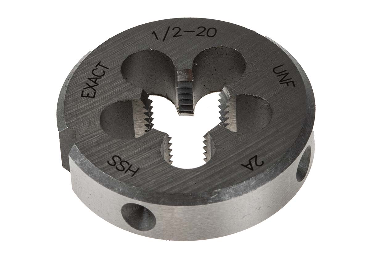 This is 1/2-20 UNF Die 38mm od manufactured by EXACT. The manufacturer part number is 04415. It has a typical thread size of 1/2-20 unf. The product is made from highly stable and reliable hss. The product has 38mm external diameter. It is 10mm thick.