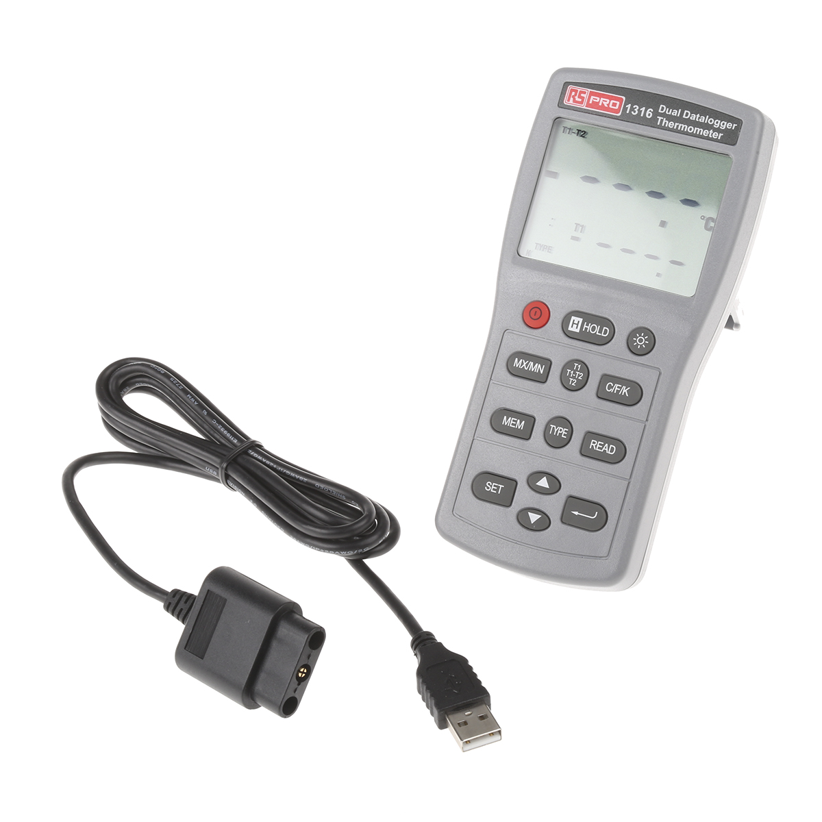 This is 1316 Digital Thermometer 2 Input Handheld E J K N R S T Type Input manufactured by RS Pro. The manufacturer part number is 123-2214. The probe is basically a e, j, k, n, r, s, t probe. In addition, it is offered with ±0.05 % best accuracy . The typical product's weight is 235g. It has minimum/maximum recordings yes . It has a/an wired type thermometer . It has a model number 1316. In addition, the height is 150mm. Furthermore, the product is 35mm wide. Its accurate length is 72mm. It has 2 temperature inputs . Additionally, it exhibits centigrade, fahrenheit, kelvin temperature scale . This aaa battery is comparatively much efficient than common batteries. Whereas, the absolute maximum temperature measurement is +1090 (j) °c, +1300 (n) °c, +1370 (k) °c, +1598 (e) °f, +1767 (r) °c, +1767 (s) °c, +1994 (j) °f, +1999.9 (k) °f, +1999.9 (n) °f, +1999.9 (r) °f, +1999.9 (s) °f, +400 (t) °c, +752 (t) °f, +870 (e) °c . Features 0.1 k resolution. It has a data storage feature yes .