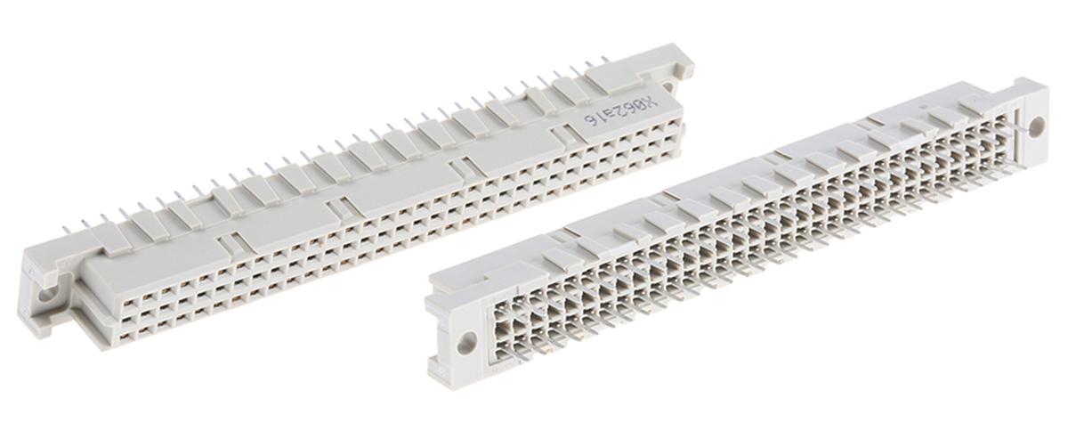 This is 64 Way 2.54mm Pitch Type C Class C2 3 Row Straight DIN 41612 Connector Socket manufactured by RS Pro. The manufacturer part number is 508-3369. It comes in 3 of rows. Furthermore, the product has c2 class rating . The product has a current rating of 2a. Whereas, the minimum operating temperature of the product is -55°c. Moreover, the product has a nominal 1 kv voltage rating. In addition, female is the available "Gender" of the product. It has straight body orientation. It allows solder termination method. The product also features robust pbt housing material. Additionally, it has a maximum 20mω contact resistance . It contains a/c row loading . The high-quality gold over nickel is used as contact plating material. Moreover, the product is 2.54mm. The product contains 64 contacts. It comes in c configuration. It has a maximum operating temperature of +125°c. The product is made from sturdy phosphor bronze materials.