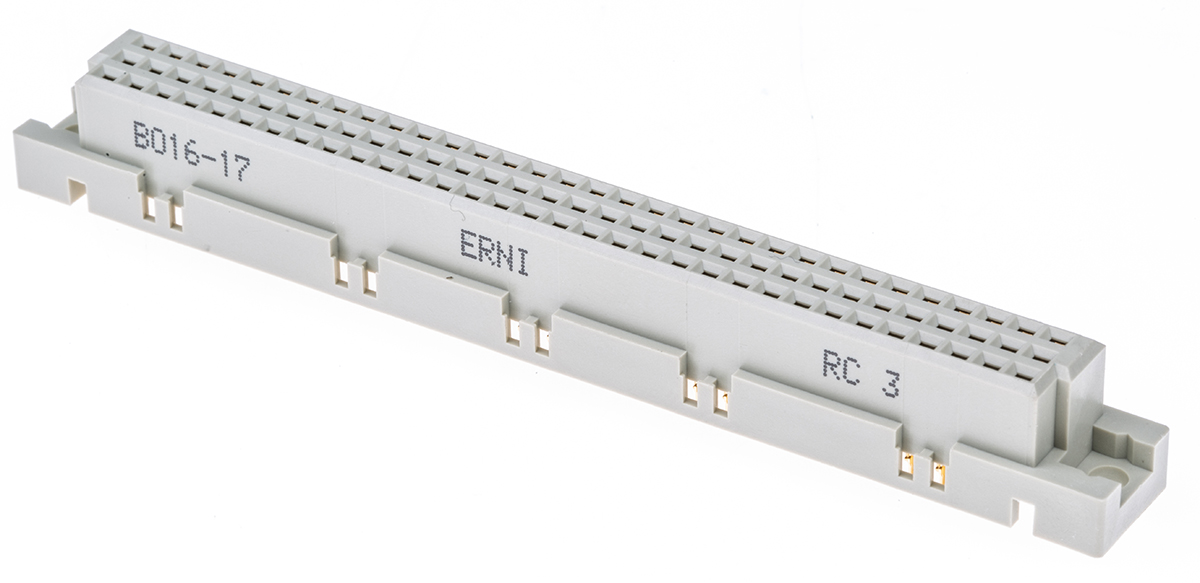 This is 96 Way 2.54mm Pitch 3 Row Straight DIN 41612 Connector Socket manufactured by ERNI. The manufacturer part number is 123905. It contains a/b/c row loading . Whereas, the minimum operating temperature of the product is -65°c. The product is available in cable mount configuration. In addition, female is the available "Gender" of the product. It has straight body orientation. It allows idt termination method. The product also features robust pbt housing material. It comes in 3 of rows. The high-quality gold is used as contact plating material. Moreover, the product is 2.54mm. The product contains 96 contacts. It has a maximum operating temperature of +125°c. The product is made from sturdy copper alloy materials.