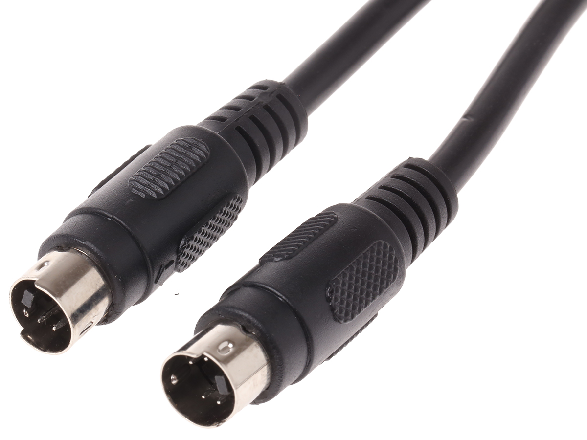 This is 1m 4-Pin Male Mini-DIN to 4-Pin Male Mini-DIN Black SVHS Audio Video Cable Assembly manufactured by RS Pro. The manufacturer part number is 742-4273. Connector 2 is a male connector. The strand size includes 7/0.12. It is a typical s-video cable. This connector 1 is a male. The sheath has an adorable black colour. Its accurate length is 1m. Whereas the outer sheath is manufactured from pvc material. While the Connector 2 is 4 pin mini-din. Connector 1 is 4 pin mini-din.