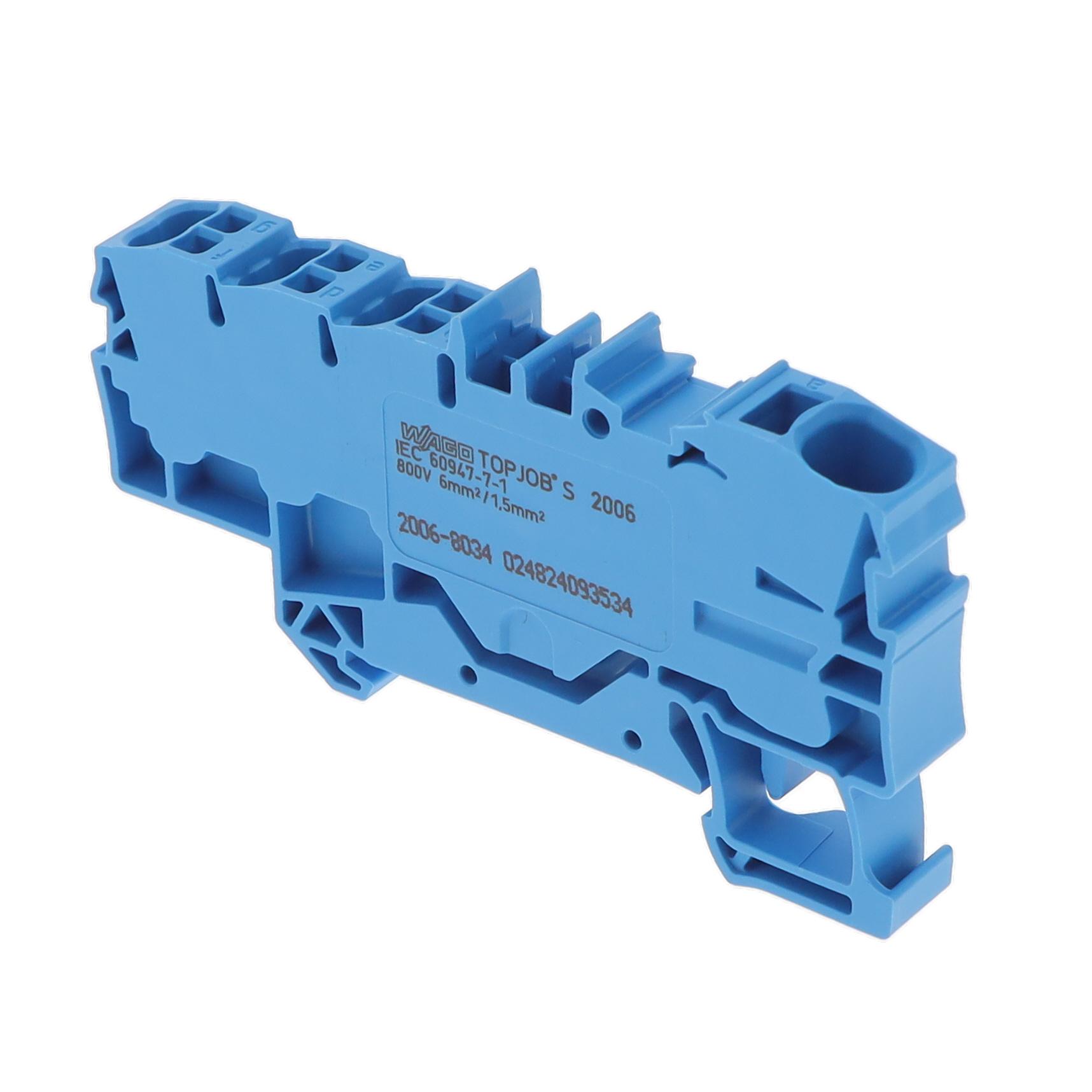 This is manufactured by WAGO Corporation. The manufacturer part number is 2006-8034. It is assigned with possible HTSUS value of 8536.69.8000. The product is rohs3 compliant. Moreover, it has push in, spring terminal style. It is designed from highly reliable polyamide (pa66), nylon 6/6 insulating material. It comes in feed through configuration. The product carries possible position value of 7. A 0.5-10mm² of wire gauge. In addition, it is reach unaffected. It carries ul94 v-0 of material flammability rating. It is shipped in bulk package . It has a stripping length of 13mm ~ 15mm. Its typical moisture sensitivity level is not applicable. An IEC current of 41 a. While 8-20 awg is its range or wire gauge. It has a long 12 weeks standard lead time. The built-in terminal is 9.0mm wide. The nominal voltage of the product is 800v. It has a classic blue colour. The product topjob®s, is a highly preferred choice for users. The product carries 1 levels. The product is designated with the ear99 code number.