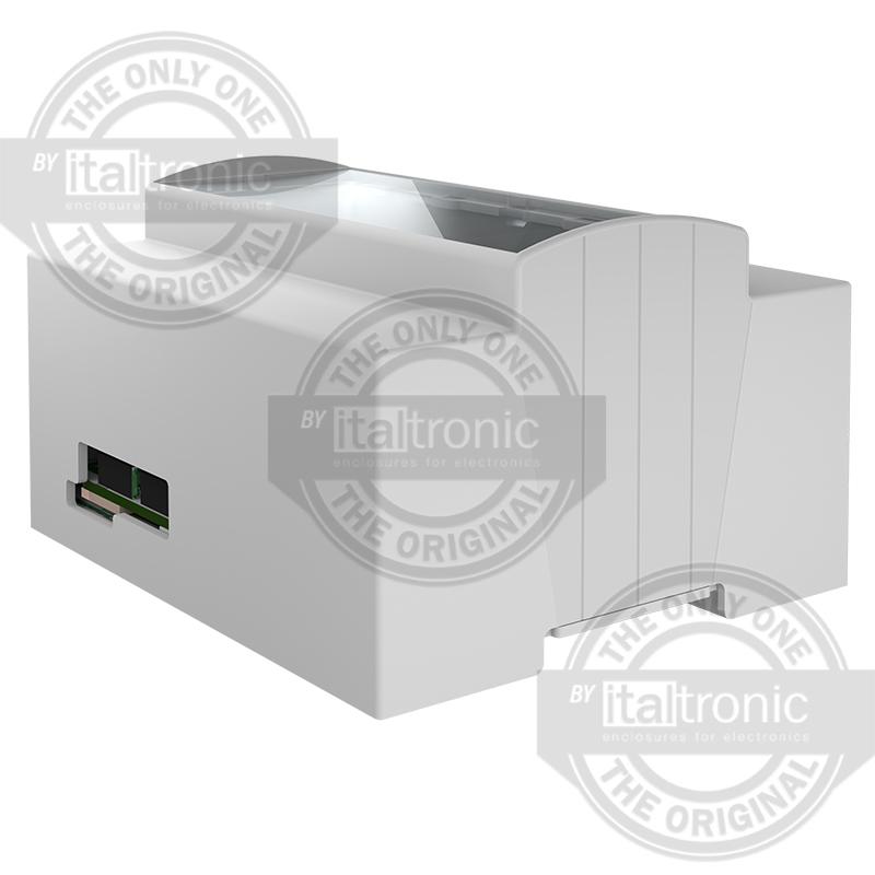 This is Solid Top Enclosure Type ABS Polycarbonate DIN Rail Enclosure Kit manufactured by Italtronic. The manufacturer part number is 25.0610000.BGG. The product is highly suitable for beaglebone green. It has a decent grey colour. Features 106.3 x 90.5 x 62mm external caliber. The product's body is nicely designed from abs materials.