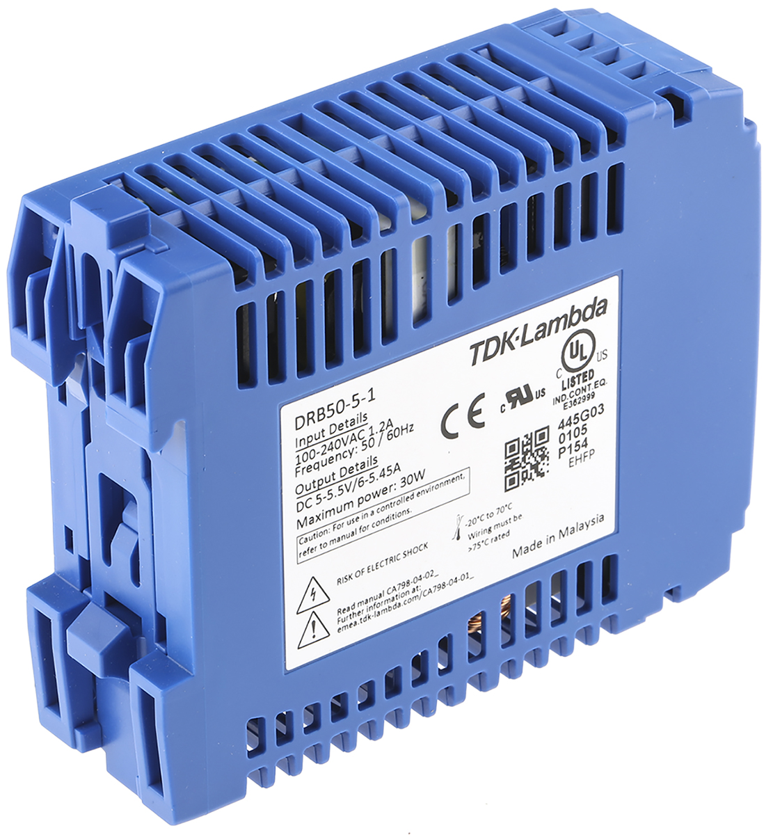 This is DRB DIN Rail Power Supply 30W 5V dc/ 6A manufactured by TDK-Lambda. The manufacturer part number is DRB-50-5-1. Additionally, the product is supplied with 1 outputs. Load Regulation - 480mv. It has a/an dc output voltage . The given dimensions of the product include 30 x 75 x 95mm. The product is available in din rail mount configuration. The product has +70°c maximum temperature. The product drb, is a highly preferred choice for users. Its electrical phase configuration includes 1. It has ac input voltage. In addition, the height is 75mm. Furthermore, the product is 75mm wide. The product comes in 90mm depth. Its input voltage is 85 → 264v ac. Features a 5v dc output voltage. While its minimum temperature is -20°c. Feature 50w of power rating. Carries 40mv ripple and noise. It comes in switched mode configuration. It carries 6a output current.