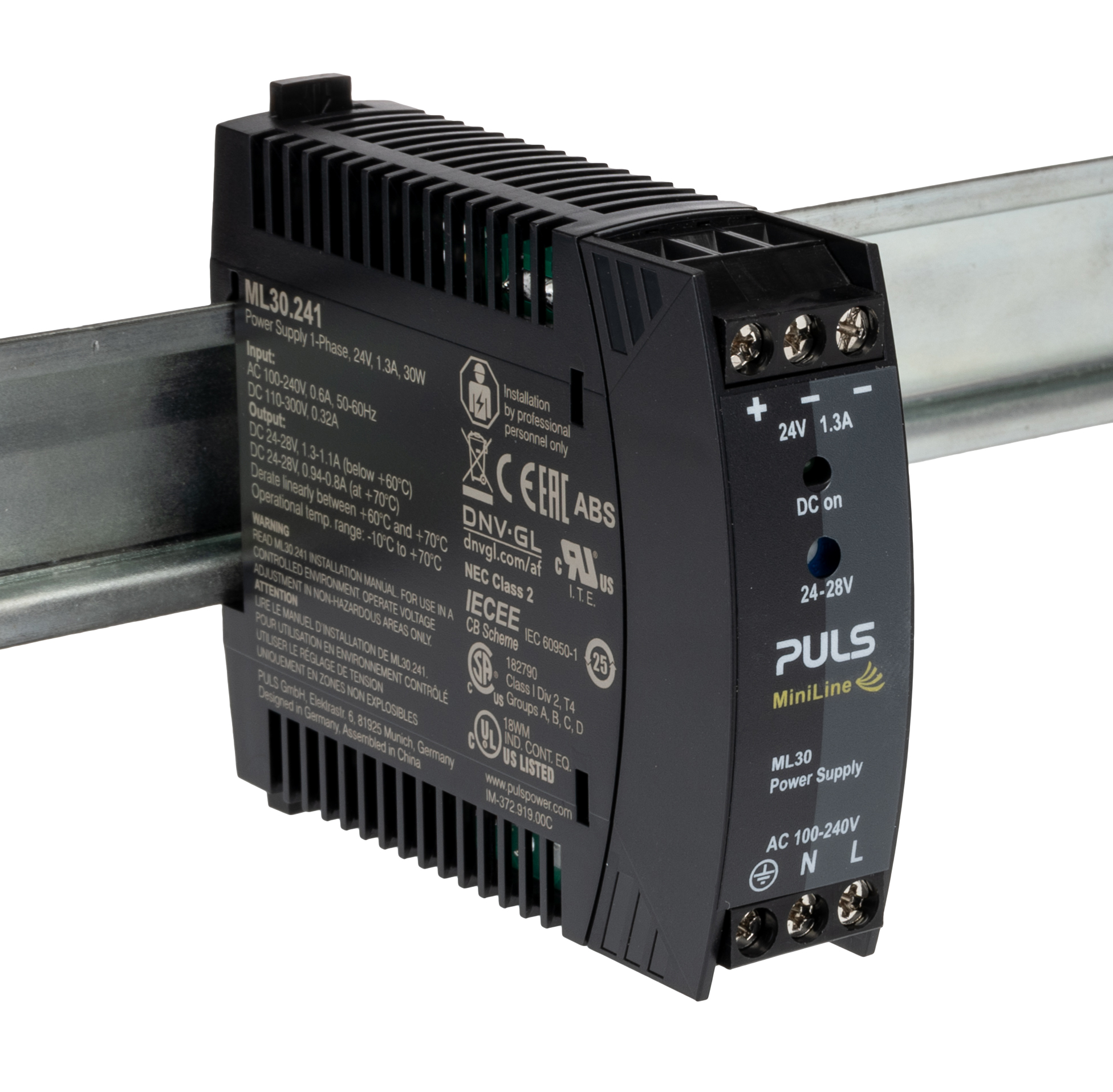 This is MiniLine 30W Switch Mode DIN Rail Panel Mount Power Supply 24V dc/ 1.3A manufactured by PULS. The manufacturer part number is ML30.241. Additionally, the product is supplied with 1 outputs. Load Regulation - 100mv. It carries 1.3a output current. The given dimensions of the product include 22.5 x 75 x 91mm. The product is available in din rail mount configuration. The product has +70°c maximum temperature. The product miniline mly, is a highly preferred choice for users. Its electrical phase configuration includes 1. It has ac input voltage. In addition, the height is 75mm. Furthermore, the product is 22.5mm wide. The product comes in 91mm depth. The MTBF values include 4124000h. Features a 24v dc output voltage. While its minimum temperature is -10°c. It has a/an dc output voltage . Carries 50mv pk-pk ripple and noise. It comes in switched mode configuration. Its input voltage is 100 → 240v ac.