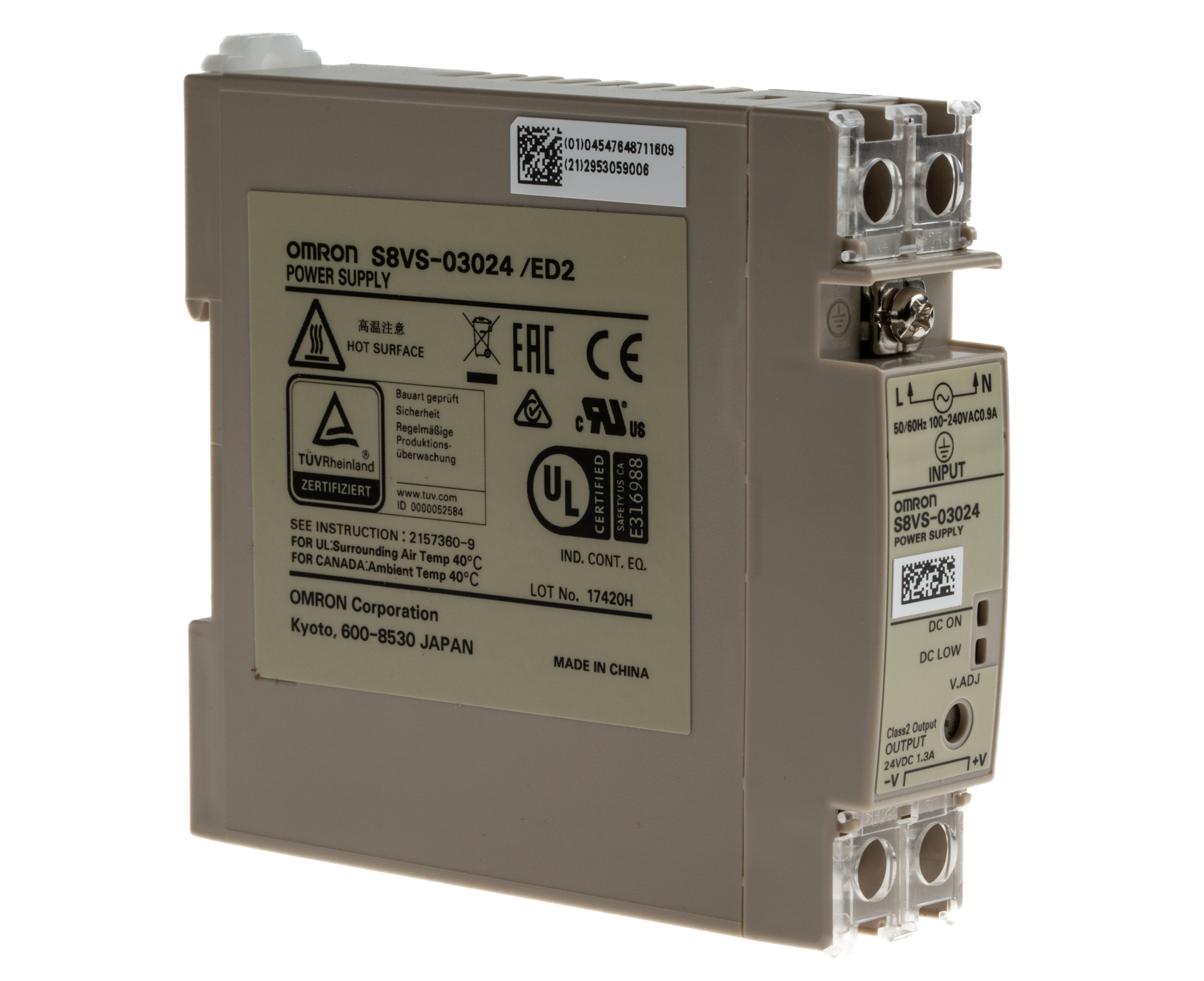 This is S8VS Switch Mode DIN Rail Panel Mount Power Supply 30W 24V dc/ 1.3A manufactured by Omron. The manufacturer part number is S8VS03024. The product has +85°c maximum temperature. It has a/an dc output voltage . The given dimensions of the product include 96.4 x 22.5 x 94.6mm. While its minimum temperature is +25°c. It has ac input voltage. Furthermore, the product is 22.5mm wide. The MTBF values include 135000h. Its electrical phase configuration includes 1. It comes in switched mode configuration. Load Regulation - ±2%. The product complies with all safety standards, such as ce certified, culus. It is a highly efficient product with an 86% of high efficiency. Its input voltage is 85 → 264v ac. Additionally, the product is supplied with 1 outputs. It has -10 → +15% of output voltage adjustment range. Carries ±2% ripple and noise. The product comes in 96.4mm depth. The product is available in din rail mount configuration. It carries 1.3a output current. The product s8vs, is a highly preferred choice for users. In addition, the height is 85mm. Features a 24v dc output voltage. Feature 30w of power rating.