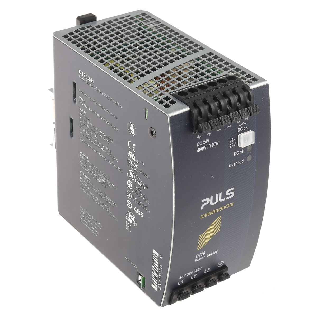 This is Dimension 480W Switch Mode DIN Rail Panel Mount Power Supply 24V dc/ 20A manufactured by PULS. The manufacturer part number is QT20.241. Additionally, the product is supplied with 1 outputs. Load Regulation - 100mv. It carries 20a output current. The given dimensions of the product include 65 x 124 x 127mm. The product is available in din rail mount configuration. The product has +70°c maximum temperature. The product dimension q, is a highly preferred choice for users. Its electrical phase configuration includes 3. It has ac input voltage. In addition, the height is 124mm. Furthermore, the product is 65mm wide. The product comes in 127mm depth. The MTBF values include 1194000h. Features a 24v dc output voltage. While its minimum temperature is -25°c. It has a/an dc output voltage . Feature 480w of power rating. Carries 100mv pk-pk ripple and noise. It comes in switched mode configuration. Its input voltage is 380 → 480v ac.