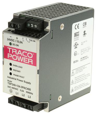 This is TSP Switch Mode DIN Rail Panel Mount Power Supply 240W 24V dc/ 10A manufactured by TRACOPOWER. The manufacturer part number is TSP240-124-3PAC400. Additionally, the product is supplied with 1 outputs. Load Regulation - ±1%. It has a/an dc output voltage . It carries 10 a output current. The product is available in din rail mount configuration. The product has +60°c maximum temperature. The product tsp, is a highly preferred choice for users. Its electrical phase configuration includes 3. It has ac input voltage. In addition, the height is 110mm. Furthermore, the product is 54mm wide. The product comes in 110mm depth. Its input voltage is 320 → 440v ac. Features a 24 v dc output voltage. While its minimum temperature is -25°c. Feature 240w of power rating. Carries 100mv pk-pk ripple and noise. It comes in switch mode configuration.