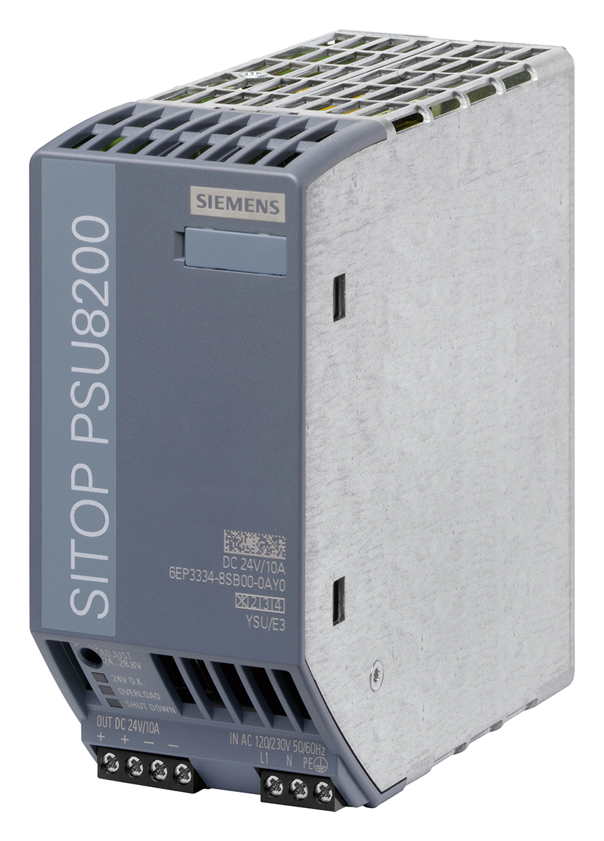 This is DIN Rail Panel Mount Power Supply 240W 24V dc/ 0 → 10A manufactured by Siemens. The manufacturer part number is 6EP3334-8SB00-0AY0. The product has +70°c maximum temperature. It has a/an dc output voltage . While its minimum temperature is -25°c. It has ac input voltage. Furthermore, the product is 55mm wide. The MTBF values include 1292102h. Its electrical phase configuration includes 1. It comes in switched mode configuration. The product complies with all safety standards, such as abs, ansi/isa-12.12.01, atex, cb, ccsaus, ce certified, csa, csa c22.2, cul listed, culus listed, e197259, en 50178, en 55022 class b, en 60529, en 60715, en 60950-1, en 61000-3-2, en 61000-6-2, gl, iecex, ul 489, ul 508, ul listed. It is a highly efficient product with an 94% of high efficiency. Its input voltage is 120 → 230v ac. Additionally, the product is supplied with 1 outputs. It has 24 → 28.8v of output voltage adjustment range. Carries 50mv pk-pk ripple and noise. The product comes in 125mm depth. The product is available in din rail mount configuration. It carries 10a output current. The product sitop psu8200, is a highly preferred choice for users. In addition, the height is 125mm. Features a 24v dc output voltage. Feature 240w of power rating.