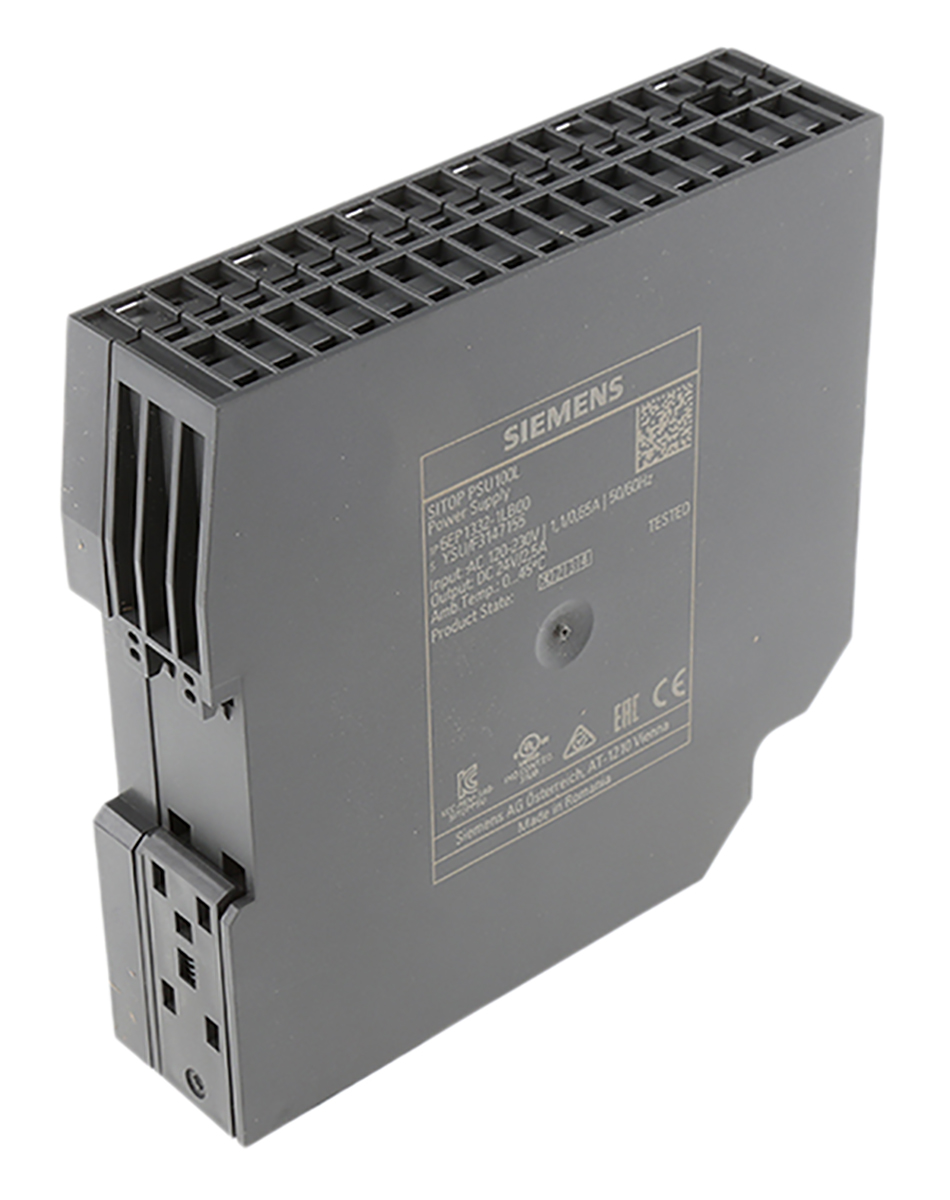 This is Switch Mode DIN Rail Panel Mount Power Supply 60W 24V dc/ 2.5A manufactured by Siemens. The manufacturer part number is 6EP1332-1LB00. The product has +60°c maximum temperature. It has a/an dc output voltage . The given dimensions of the product include 125 x 32.5 x 125mm. While its minimum temperature is 0°c. It has ac input voltage. Furthermore, the product is 32.5mm wide. The MTBF values include 3153082h. Its electrical phase configuration includes 1. It comes in switched mode configuration. Load Regulation - 0.5%. The product complies with all safety standards, such as ce. It is a highly efficient product with an 85% of high efficiency. Its input voltage is 93 → 132v ac. Additionally, the product is supplied with 1 outputs. It has 22.8 → 26.4v of output voltage adjustment range. Carries 150mv pk-pk ripple and noise. The product comes in 120mm depth. The product is available in din rail mount configuration. It carries 2.5a output current. The product sitop psu100l, is a highly preferred choice for users. In addition, the height is 125mm. Features a 24v dc output voltage. Feature 60w of power rating.