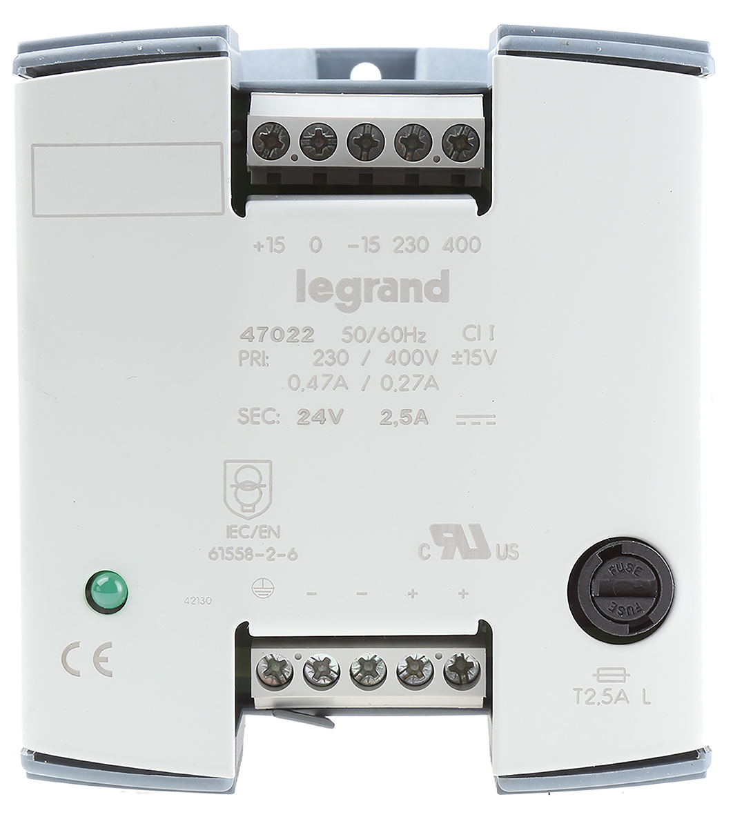 This is Linear DIN Rail Panel Mount Power Supply 60W 24V dc/ 2.5A manufactured by Legrand. The manufacturer part number is 0 470 22. Carries ±3% ripple and noise. It has a/an dc output voltage . The given dimensions of the product include 121 x 93 x 105mm. The product is available in din rail mount configuration. The product has +60°c maximum temperature. While its minimum temperature is -10°c. Its electrical phase configuration includes 1. It has ac input voltage. In addition, the height is 93mm. Furthermore, the product is 93mm wide. The product comes in 105mm depth. Its input voltage is 230 v ac → 400v ac. Features a 24v dc output voltage. It comes in linear configuration. It carries 2.5a output current.