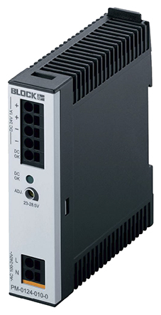This is DIN Rail Power Supply 24V dc/ 1A manufactured by Block. The manufacturer part number is PM-0124-010-0. Additionally, the product is supplied with 1 outputs. It has 23.0 to 28.5v of output voltage adjustment range. Carries 20mv pk-pk ripple and noise. It has a/an dc output voltage . The product complies with all safety standards, such as culus, curus, en, gl, ul, ul/csa. The product is available in din rail mount configuration. It is a highly efficient product with an 86.0% of high efficiency. The product has +70°c maximum temperature. The product pm, is a highly preferred choice for users. Its electrical phase configuration includes 1. It has ac, dc input voltage. In addition, the height is 90mm. Furthermore, the product is 225mm wide. The product comes in 91mm depth. Its input voltage is 85 → 264 v ac / 120 → 373v dc. Features a 24v dc output voltage. While its minimum temperature is -25°c. The product also provides special features, such as constant current characteristic, push-in terminals, stabilised and adjustable output voltage. It comes in switched mode configuration. It carries 1a output current.