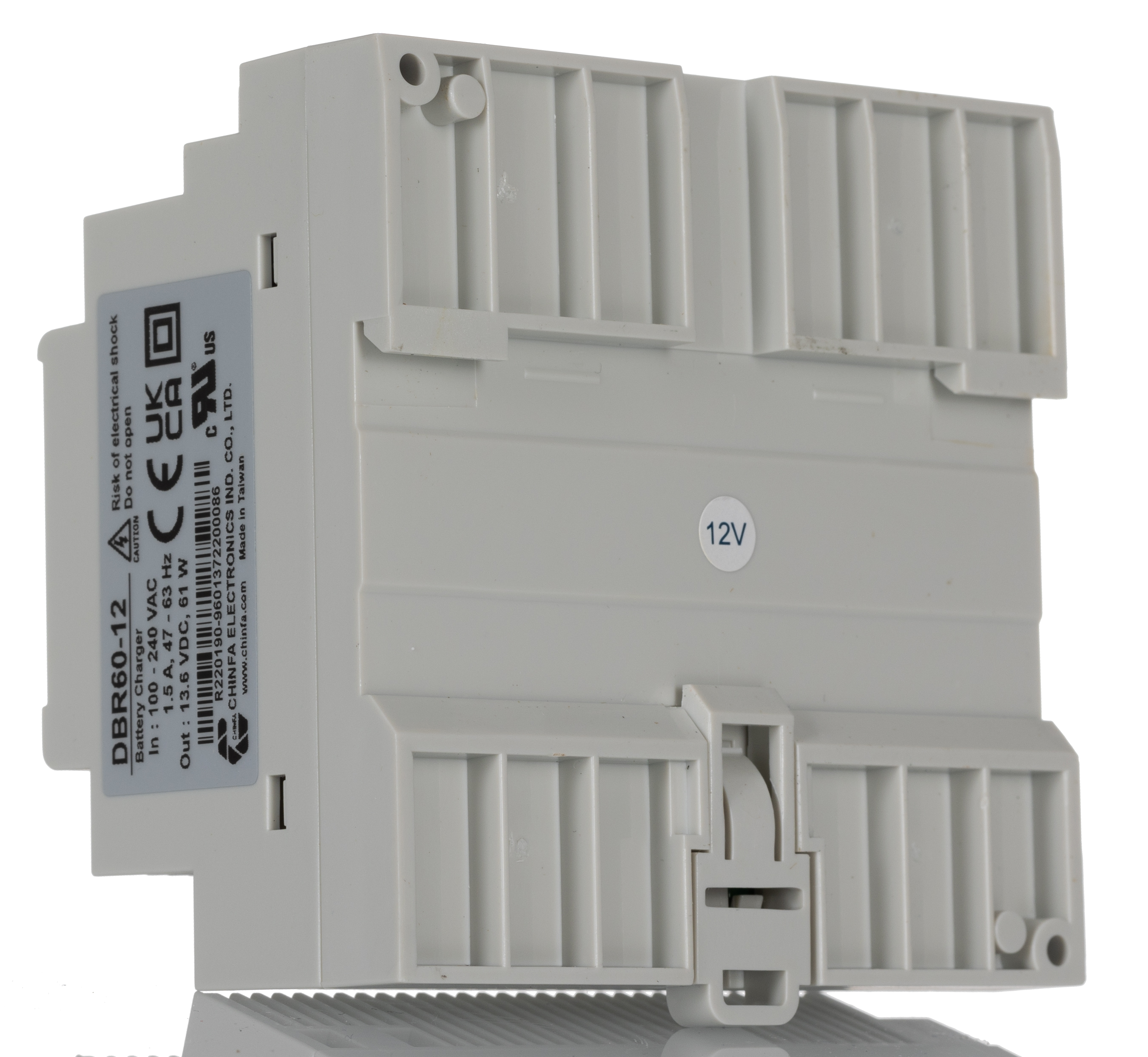 This is 61W Battery Charger DIN Rail Panel Mount Power Supply 12V dc/ 4.5A manufactured by Chinfa. The manufacturer part number is DBR60-12.