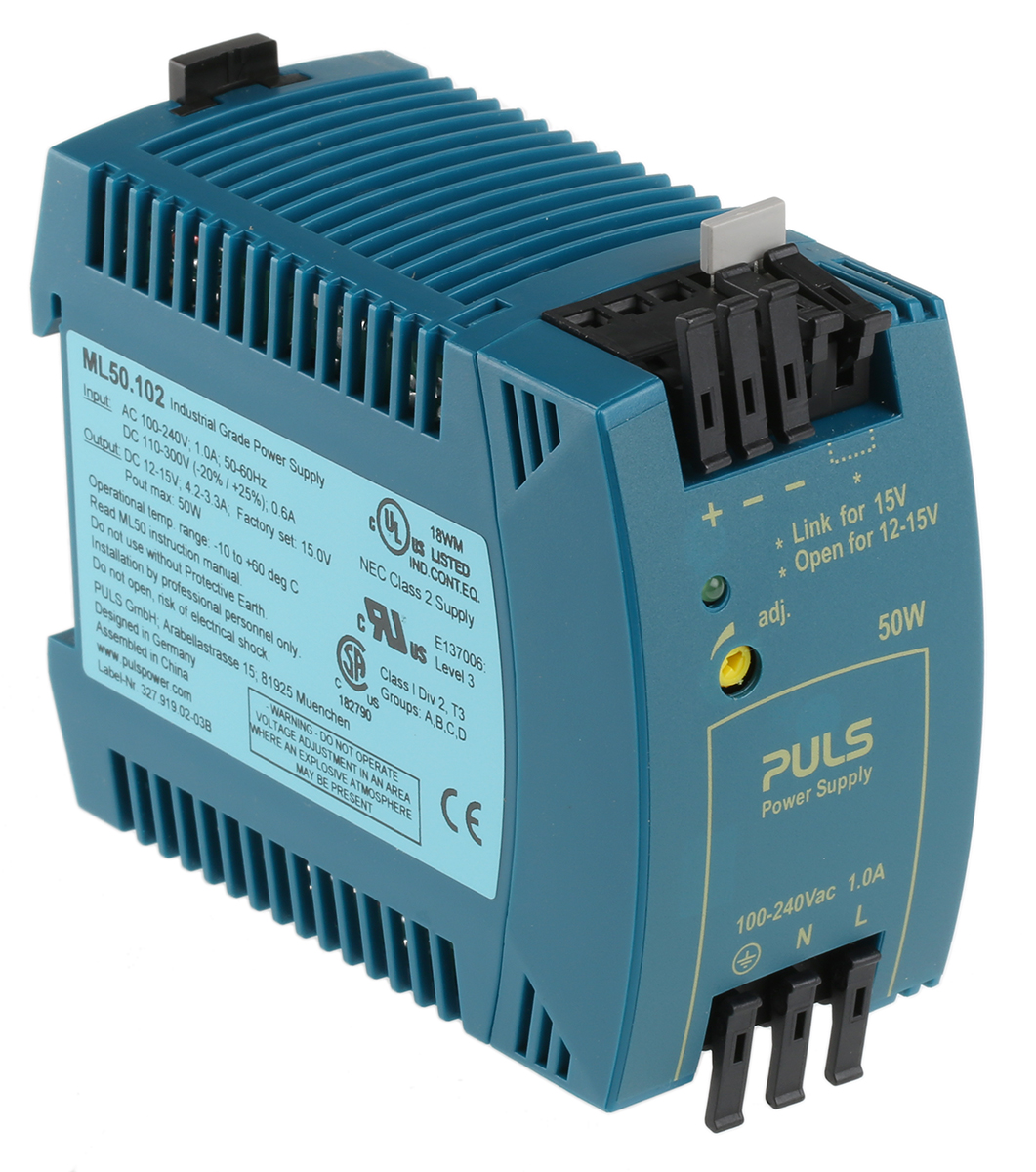 This is MiniLine MLY Switch Mode DIN Rail Panel Mount Power Supply 50W 12 → 15V dc/ 4.2A manufactured by PULS. The manufacturer part number is ML50.102. Additionally, the product is supplied with 1 outputs. Load Regulation - 360mv. It carries 4.2a output current. The given dimensions of the product include 45 x 75 x 91mm. The product is available in din rail mount configuration. The product has +70°c maximum temperature. The product miniline mly, is a highly preferred choice for users. Its electrical phase configuration includes 1. It has ac input voltage. In addition, the height is 75mm. Furthermore, the product is 45mm wide. The product comes in 91mm depth. The MTBF values include 600000h. Features a 15v dc output voltage. While its minimum temperature is -10°c. It has a/an dc output voltage . Carries 100mv pk-pk ripple and noise. It comes in switched mode configuration. Its input voltage is 100 → 240v ac.