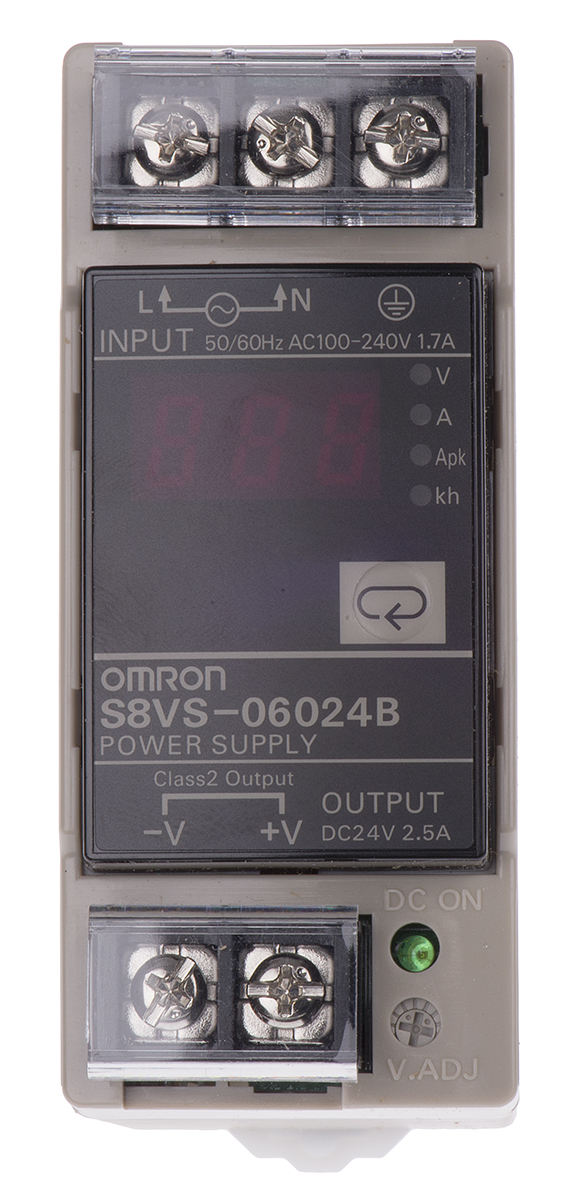 This is S8VS Switch Mode DIN Rail Panel Mount Power Supply 60W 24V dc/ 2.5A manufactured by Omron. The manufacturer part number is S8VS-06024B. Additionally, the product is supplied with 1 outputs. Load Regulation - ±1.5%. It carries 2.5a output current. The given dimensions of the product include 108.3 x 40 x 99.5mm. The product is available in din rail mount configuration. It is a highly efficient product with an 78% of high efficiency. The product has +60°c maximum temperature. The product s8vs, is a highly preferred choice for users. Its electrical phase configuration includes 1. It has ac input voltage. In addition, the height is 95mm. Furthermore, the product is 40mm wide. The product comes in 108.3mm depth. The MTBF values include 135000h. Features a 24v dc output voltage. While its minimum temperature is -10°c. It has a/an dc output voltage . Carries ±2% ripple and noise. It comes in switched mode configuration. Its input voltage is 85 → 264v ac.