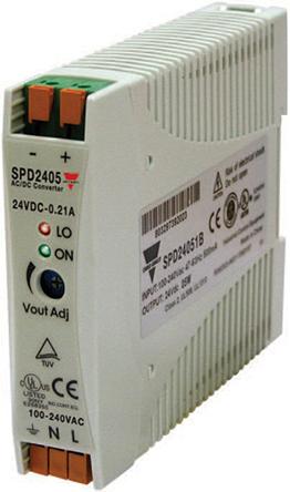 This is Switch Mode DIN Rail Power Supply 5W 24V dc/ 210mA manufactured by Carlo Gavazzi. The manufacturer part number is SPD24051B. Additionally, the product is supplied with 1 outputs. Load Regulation - ±2%. It has a/an dc output voltage . It carries 210ma output current. The product is available in din rail mount configuration. The product has +71°c maximum temperature. Its electrical phase configuration includes 1. It has ac, dc input voltage. In addition, the height is 90mm. Carries 50mv pk-pk ripple and noise. The product comes in 114mm depth. Its input voltage is 90 → 265v ac. Features a 24v dc output voltage. Feature 5w of power rating. It comes in switch mode configuration.