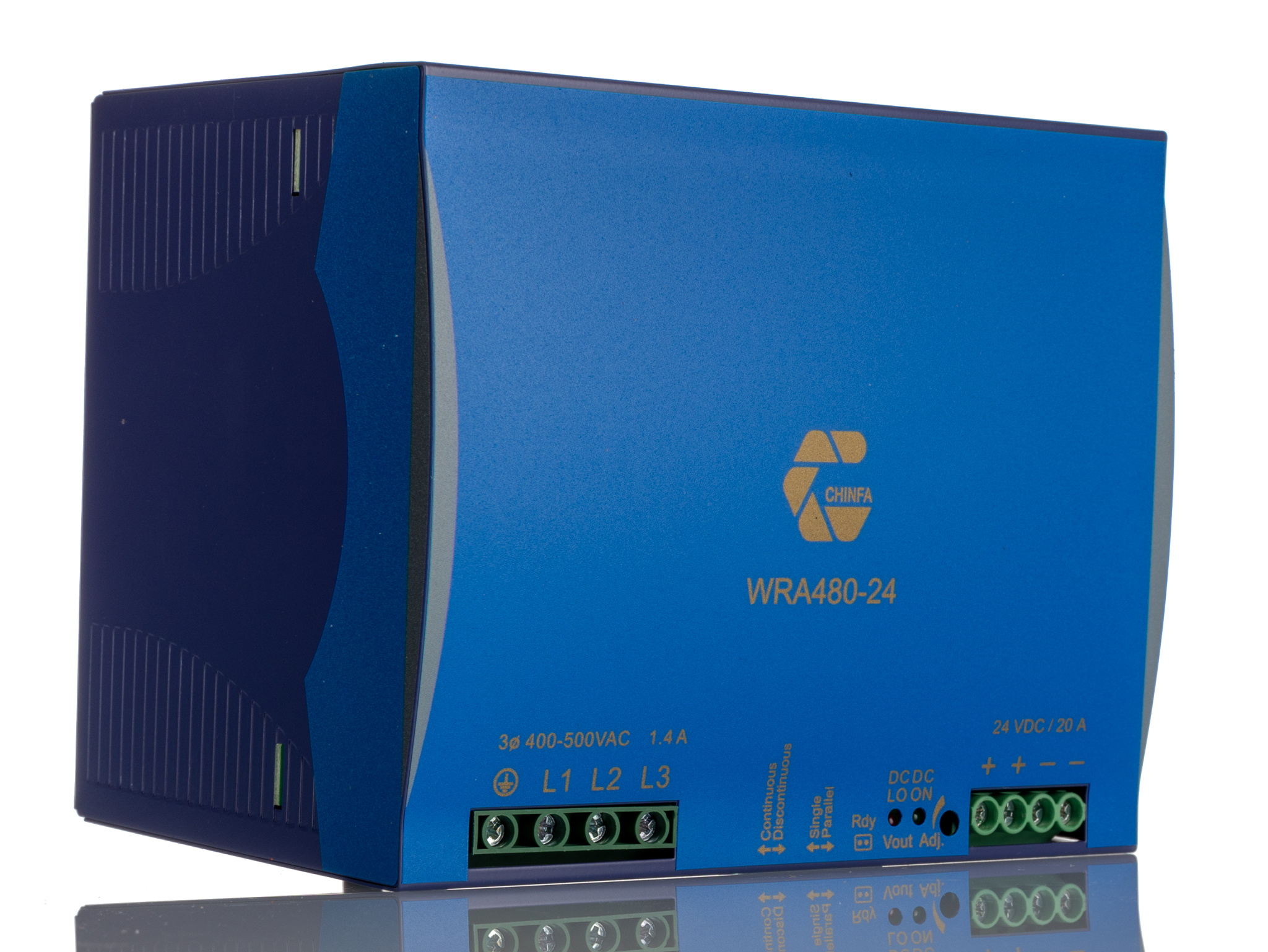 This is 480W DIN Rail Power Supply 24V dc/ 20A manufactured by Chinfa. The manufacturer part number is WRA480-24. Additionally, the product is supplied with 1 outputs. Load Regulation - ±1 %, ±5 %. It carries 20a output current. The given dimensions of the product include 150 x 124 x 111.9mm. The product is available in din rail mount configuration. The product has +71°c maximum temperature. The product wra 480, is a highly preferred choice for users. Its electrical phase configuration includes 3. It has ac input voltage. In addition, the height is 124mm. Furthermore, the product is 150mm wide. The product comes in 119mm depth. The MTBF values include 411000h. Features a 24v dc output voltage. While its minimum temperature is -30°c. It has a/an dc output voltage . Carries 100mv pk-pk ripple and noise. It comes in switched mode configuration. Its input voltage is 400v ac. The product complies with all safety standards, such as en 55032, en 61558-1, en 61558-2-16, en 62368-1, ul 508, ul 62368-1.