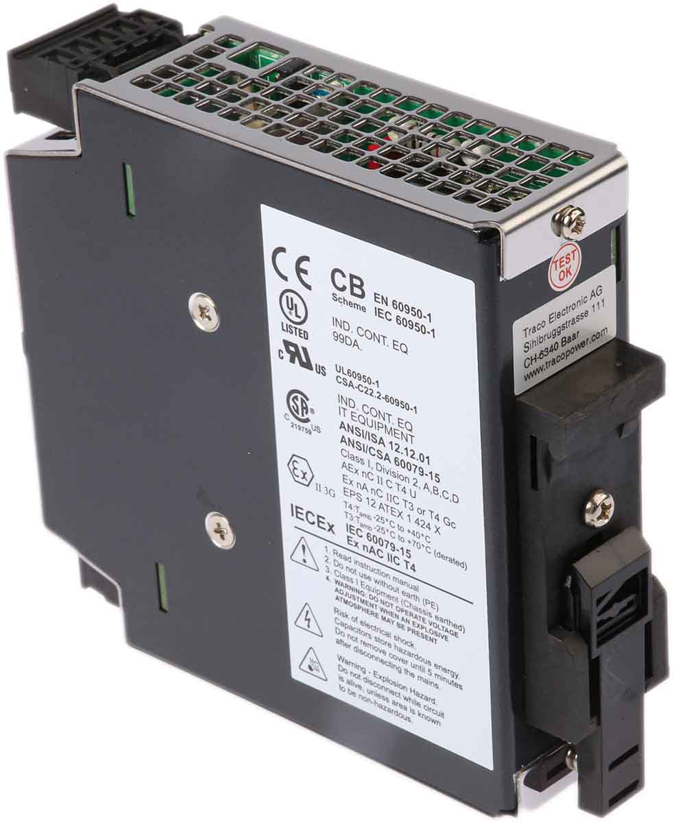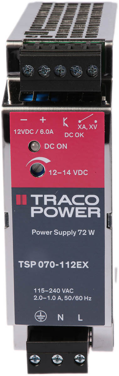 This is 72W Switch Mode DIN Rail Panel Mount Power Supply 12V dc/ 6A manufactured by TRACOPOWER. The manufacturer part number is TSP 070-112 EX. The product has +70°c maximum temperature. It has a/an dc output voltage . The given dimensions of the product include 110 x 35 x 110mm. While its minimum temperature is -25°c. It has ac input voltage. Furthermore, the product is 35mm wide. The MTBF values include 1800000h. Its electrical phase configuration includes 1. It comes in switched mode configuration. Load Regulation - ±0.5%. The product complies with all safety standards, such as ce. It is a highly efficient product with an 87% of high efficiency. Its input voltage is 85 → 264v ac. Additionally, the product is supplied with 1 outputs. It has 12 → 14v of output voltage adjustment range. Carries 200mv pk-pk ripple and noise. The product is certified with atex hazardous area certification. The product comes in 110mm depth. The product also provides special features, such as overvoltage and short circuit protection. The product is available in din rail mount configuration. It carries 6a output current. The product tsp, is a highly preferred choice for users. In addition, the height is 110mm. Features a 12v dc output voltage.