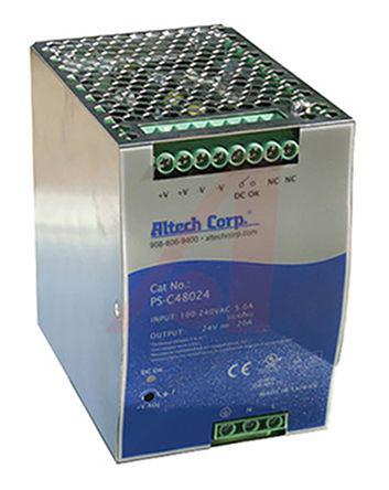 This is PS-C480 Switch Mode DIN Rail Power Supply 480W 48V dc/ 10A manufactured by Altech. The manufacturer part number is PS-C48048. The product has +70°c maximum temperature. It has a/an dc output voltage . While its minimum temperature is -25°c. It has ac, dc input voltage. Furthermore, the product is 85.5mm wide. The MTBF values include 112.9kh. Its electrical phase configuration includes 1. It comes in switch mode configuration. It is a highly efficient product with an 94.0% of high efficiency. Its input voltage is 90 → 264v ac. Additionally, the product is supplied with 1 outputs. It has 48.0 to 55.0v of output voltage adjustment range. Carries 120mv pk-pk ripple and noise. The product comes in 128.5mm depth. The product also provides special features, such as built-in constant current limiting circuit, built-in dc ok relay contact, cooling by free air convection, led indicator. The product is available in din rail mount configuration. It carries 10 a output current. The product ps-c480, is a highly preferred choice for users. In addition, the height is 125.2mm. Features a 48 v dc output voltage. Feature 480w of power rating.