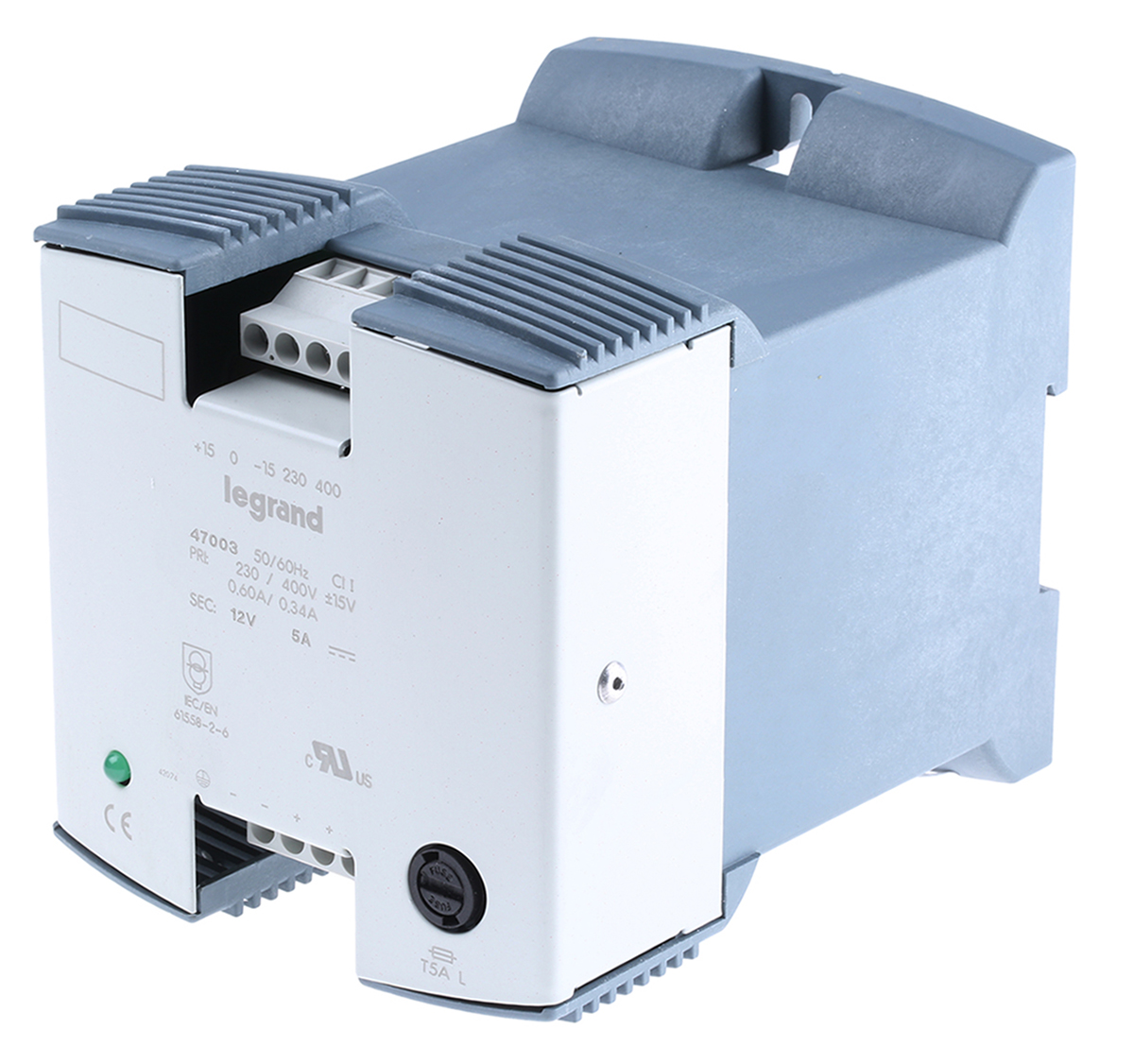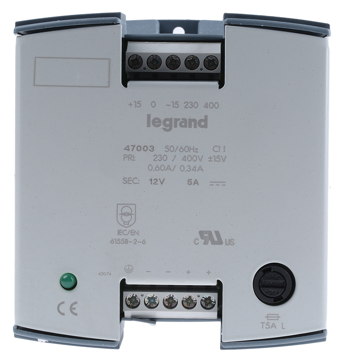 This is 60W Linear DIN Rail Panel Mount Power Supply 12V dc/ 5A manufactured by Legrand. The manufacturer part number is 0 470 03. Carries ±3% ripple and noise. It has a/an dc output voltage . The given dimensions of the product include 135 x 105 x 115mm. The product is available in din rail mount configuration. The product has +60°c maximum temperature. While its minimum temperature is -10°c. Its electrical phase configuration includes 1. It has ac input voltage. In addition, the height is 105mm. Furthermore, the product is 105mm wide. The product comes in 115mm depth. Its input voltage is 230 v ac → 400v ac. Features a 12v dc output voltage. It comes in linear configuration. It carries 5a output current.