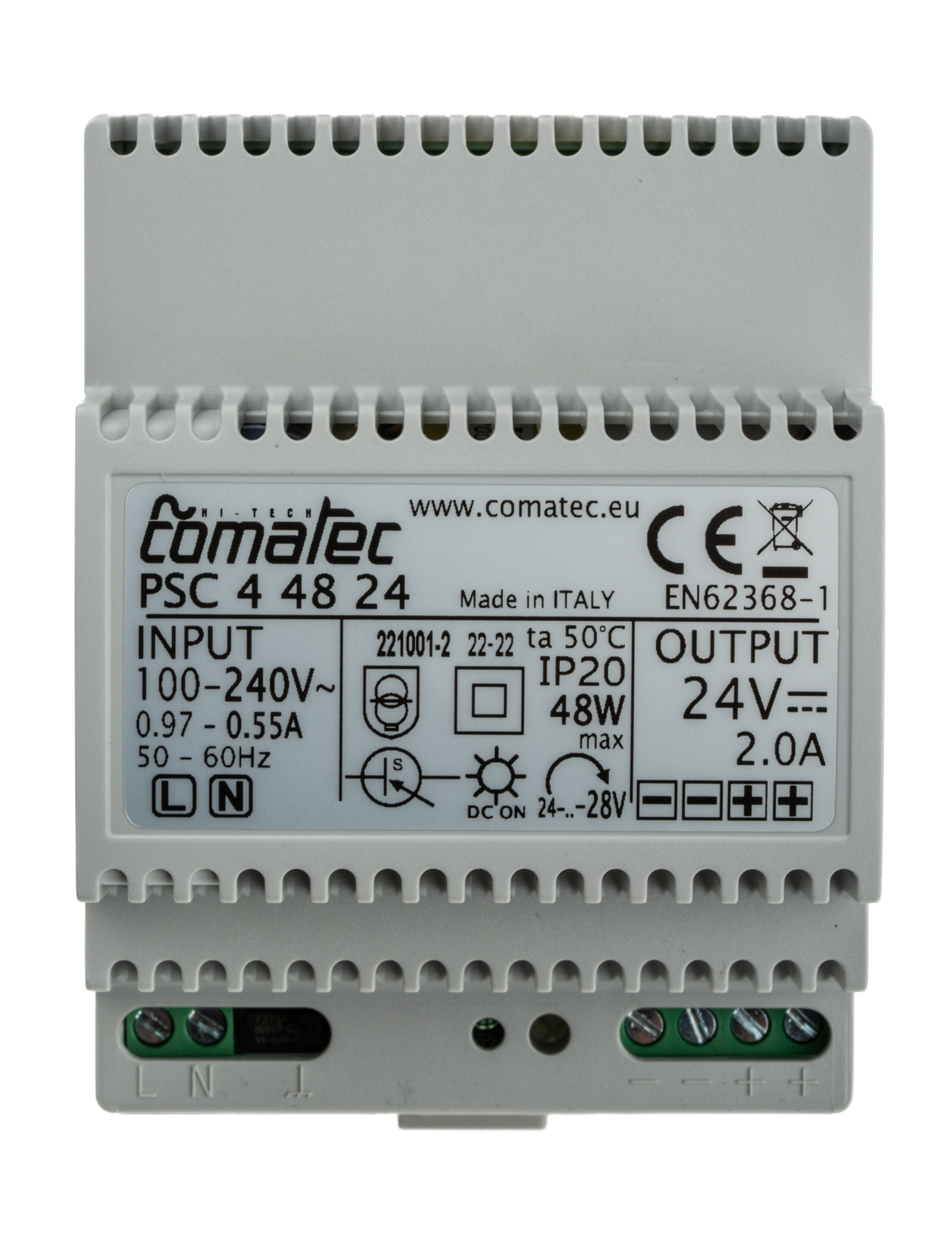 This is PSC DIN Rail Power Supply 48W 24V dc/ 2A manufactured by Comatec. The manufacturer part number is PSC4.48.24. Additionally, the product is supplied with 1 outputs. It has ±3% of output voltage adjustment range. The product has +50°c maximum temperature. It has a/an dc output voltage . The given dimensions of the product include 93 x 72 x 68mm. The product is available in din rail mount configuration. The product psc, is a highly preferred choice for users. Its electrical phase configuration includes 1. It has ac input voltage. In addition, the height is 93mm. Furthermore, the product is 72mm wide. The product comes in 68mm depth. Its input voltage is 230v ac. Features a 24v dc output voltage. While its minimum temperature is -10°c. The product also provides special features, such as high efficiency, high reliability, long life. It carries 2a output current. The product complies with all safety standards, such as class ii, en 55022, en 55024, en 60950-1, en 61000-3-2-3 class c, fcc part 15 class b.