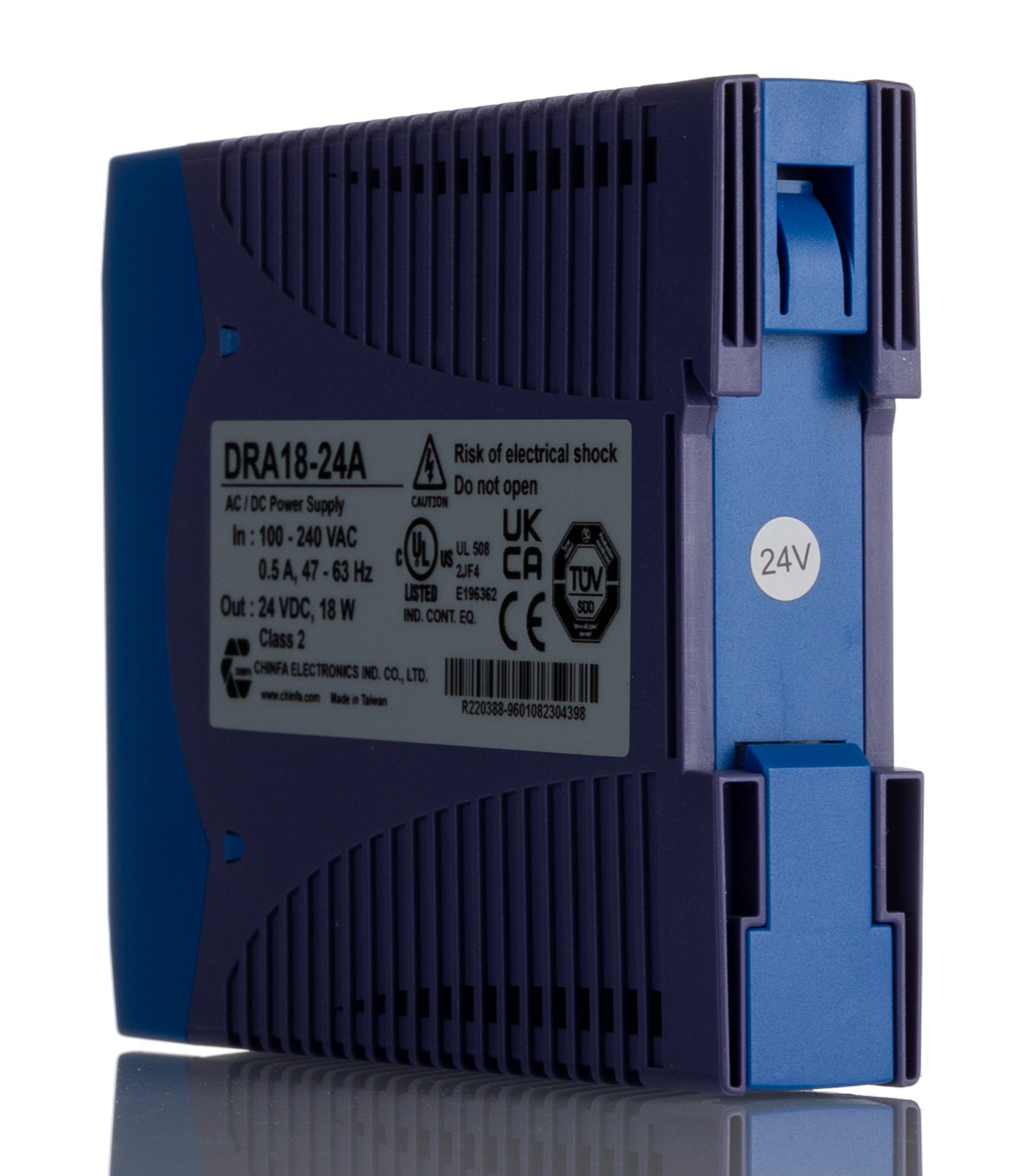 This is 18W DIN Rail Power Supply 24V dc/ 750mA manufactured by Chinfa. The manufacturer part number is DRA18-24A. Additionally, the product is supplied with 1 outputs. Carries 50mv ripple and noise. It carries 750ma output current. The product complies with all safety standards, such as en 55032, en 62368-1, ul 508, ul 62368-1. The product is available in din rail mount configuration. The product has +71°c maximum temperature. The product dra18, is a highly preferred choice for users. Its electrical phase configuration includes 1. The product also provides special features, such as internal input filter. It has ac input voltage. In addition, the height is 90mm. Furthermore, the product is 22.5mm wide. The product comes in 114mm depth. The MTBF values include 764000h. Features a 24v dc output voltage. While its minimum temperature is -20°c. It has a/an dc output voltage . Feature 18w of power rating. Its input voltage is 90 → 264v ac.
