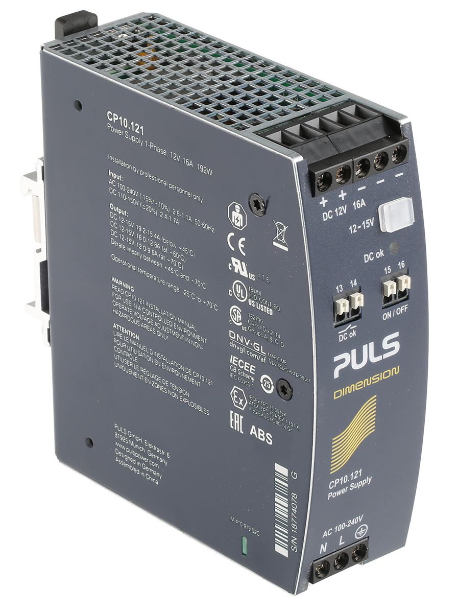 This is 192W DIN Rail Power Supply 12V dc/ 16A manufactured by PULS. The manufacturer part number is CP10.121. Additionally, the product is supplied with 1 outputs. Carries 50mv pk-pk ripple and noise. It carries 16a output current. The product complies with all safety standards, such as ce certified, csa certified, culus listed, culus recognized, gl, iecex atex. The product is available in din rail mount configuration. The product has +70°c maximum temperature. The product dimension, is a highly preferred choice for users. Its electrical phase configuration includes 1. It has ac input voltage. In addition, the height is 124mm. The product is certified with atex, iecex hazardous area certification. Furthermore, the product is 117mm wide. The product comes in 117mm depth. The MTBF values include 534000h. Features a 12v dc output voltage. While its minimum temperature is -25°c. It has a/an dc output voltage . Its input voltage is 100 → 240v ac.