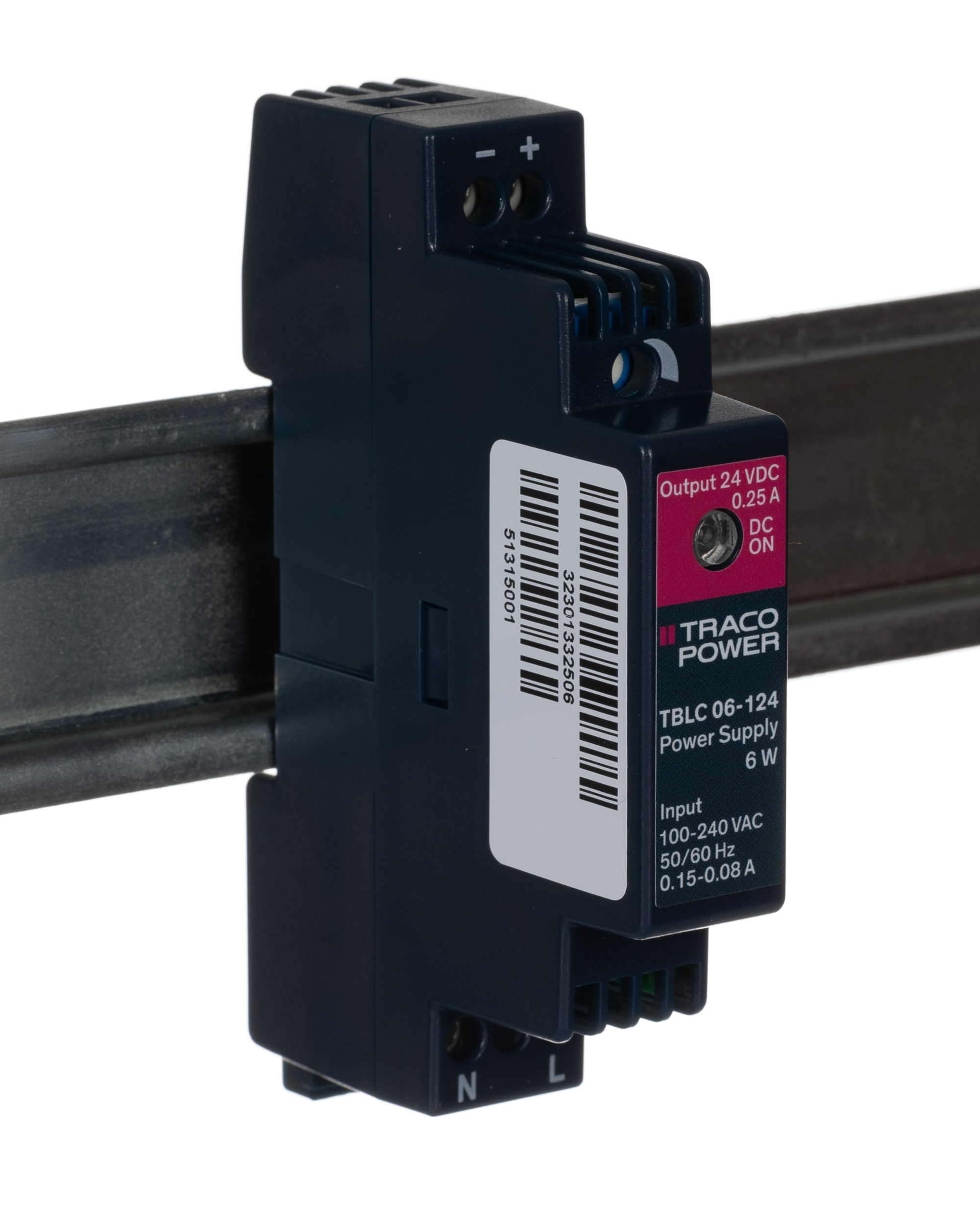 This is TBLC DIN Rail Power Supply 6W 250mA manufactured by TRACOPOWER. The manufacturer part number is TBLC 06-124. The product has +70°c maximum temperature. It has a/an dc output voltage . The given dimensions of the product include 89.5 x 18 x 59.5mm. While its minimum temperature is -25°c. It has ac input voltage. Furthermore, the product is 18mm wide. The MTBF values include 1900000h. Its electrical phase configuration includes 1. It comes in switched mode configuration. Load Regulation - 0.3%. The product complies with all safety standards, such as erp compliant. It is a highly efficient product with an 79% of high efficiency. Its input voltage is 85 → 264v ac. Additionally, the product is supplied with 1 outputs. It has 24 → 28v of output voltage adjustment range. Carries 50mv pk-pk ripple and noise. The product comes in 89.5mm depth. The product also provides special features, such as adjustable output voltage, compliant to new standby power & efficiency requirements, low output ripples & spikes. The product is available in din rail mount configuration. It carries 250ma output current. The product tblc 06, is a highly preferred choice for users. In addition, the height is 59.5mm. Features a 24v dc output voltage.
